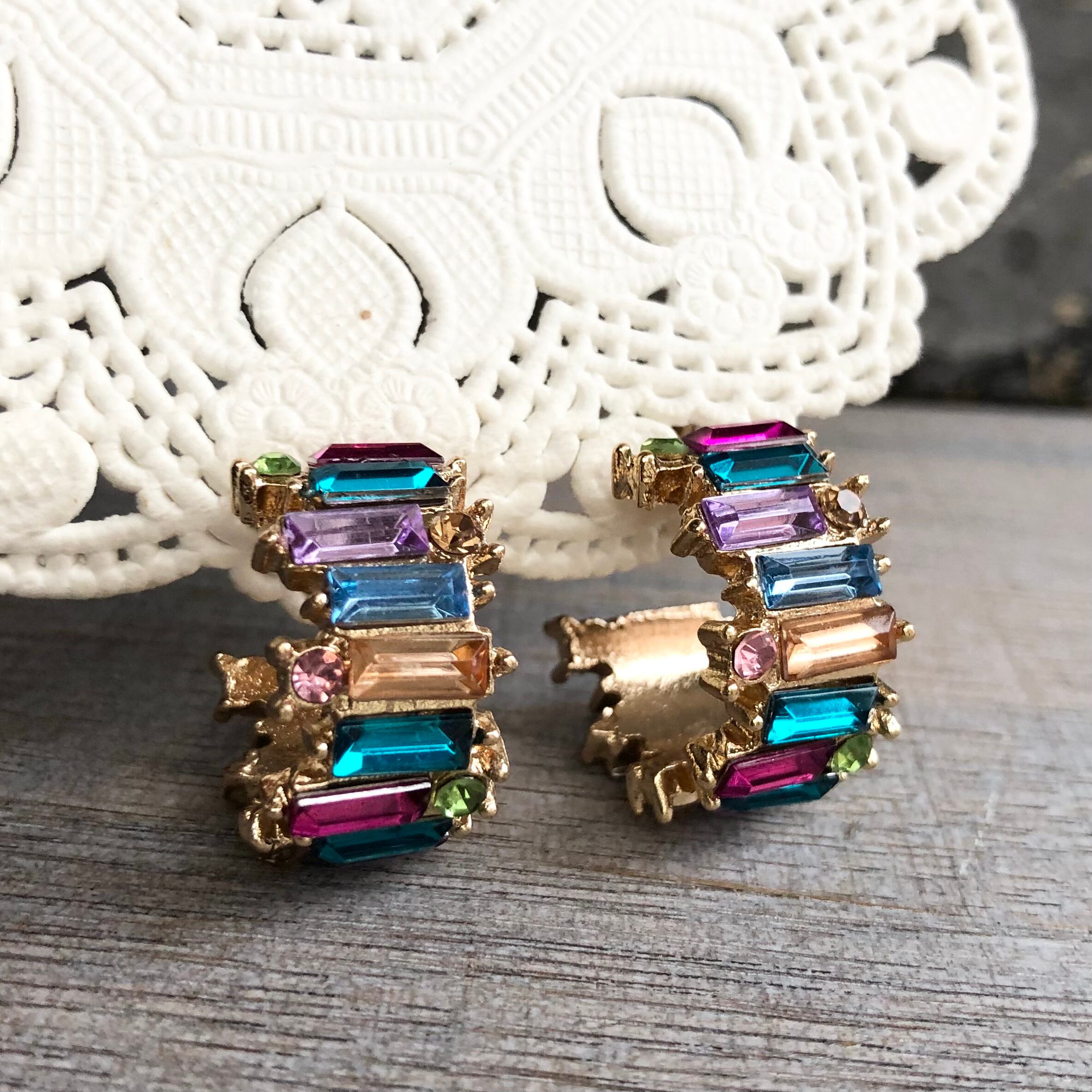 ヴィンテージ風 レトロ ランダム ビジュー フープ ピアス カラフル キラキラ 宝石 おもちゃ 昭和 アクセサリー コスチュームジュエリー 派手 可愛い 綺麗 ラインストーン