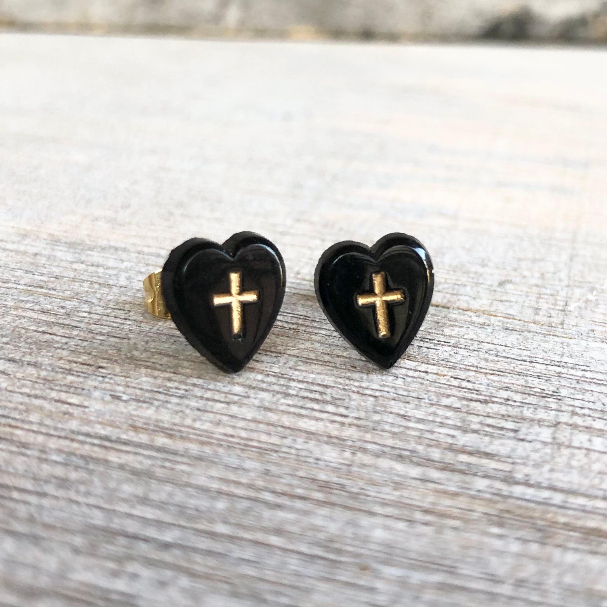 ヴィンテージ ブラック クロス ハート ガラス カボション ピアス イヤリング ノンホールピアス 樹脂ピアス 黒 十字架 ビンテージ シンプル 可愛い