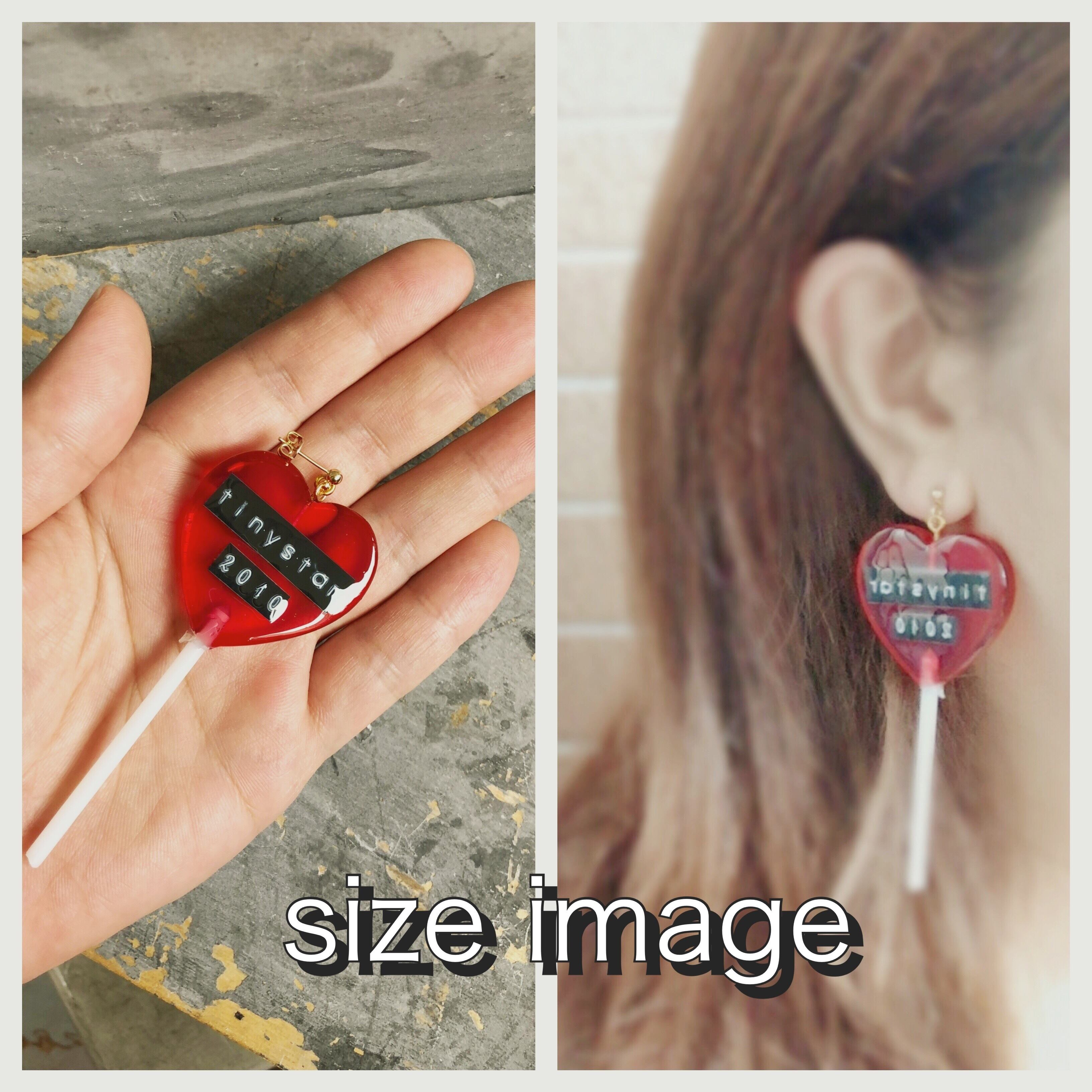 本物みたいで美味しそうなハート型のロリポップとレトロなロゴシールを合わせてピアスにしました!