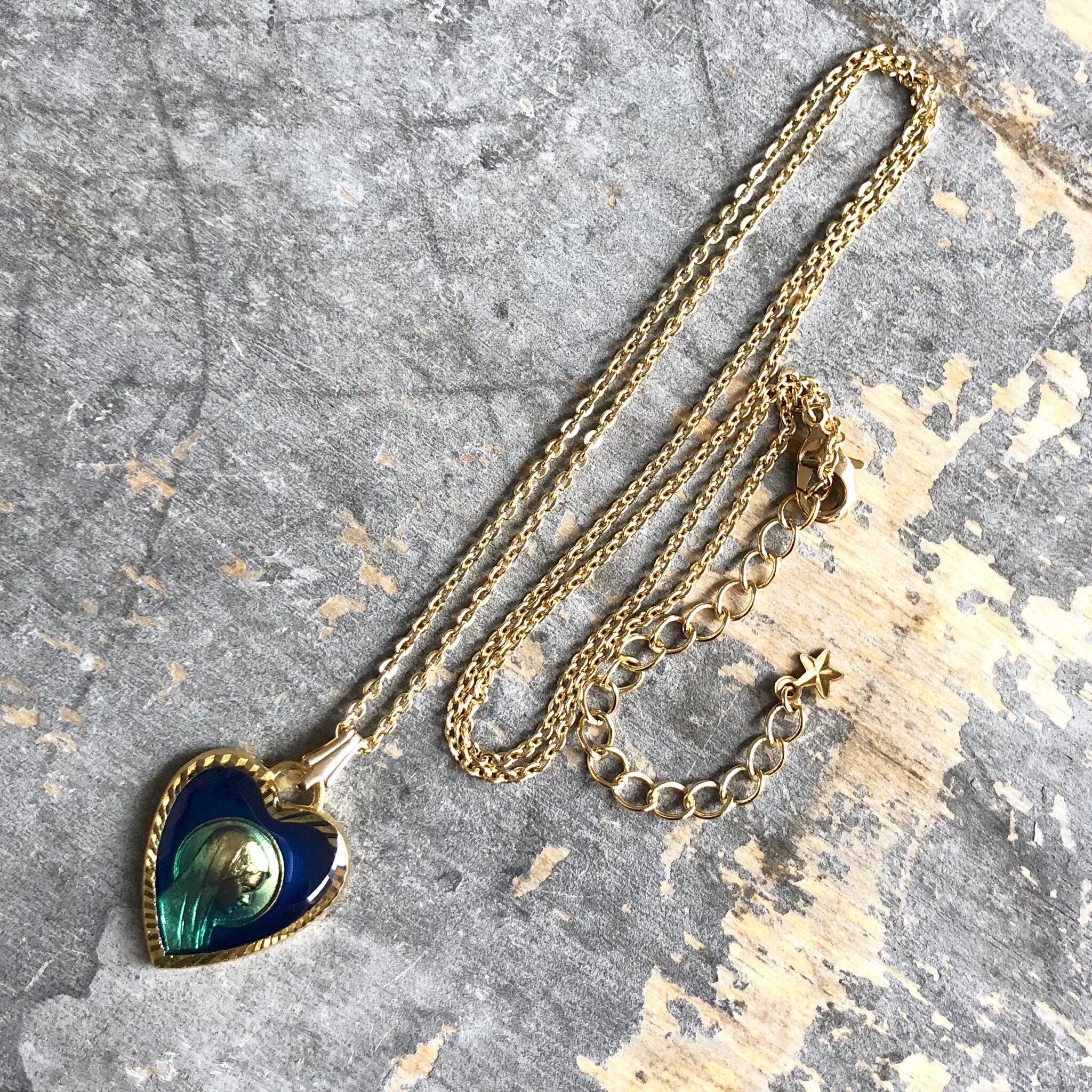 深い不透明なロイヤルブルーと、透明感のある海のようなブルーグリーンのグラデーションが綺麗なマリア様のハートメダイネックレスです。