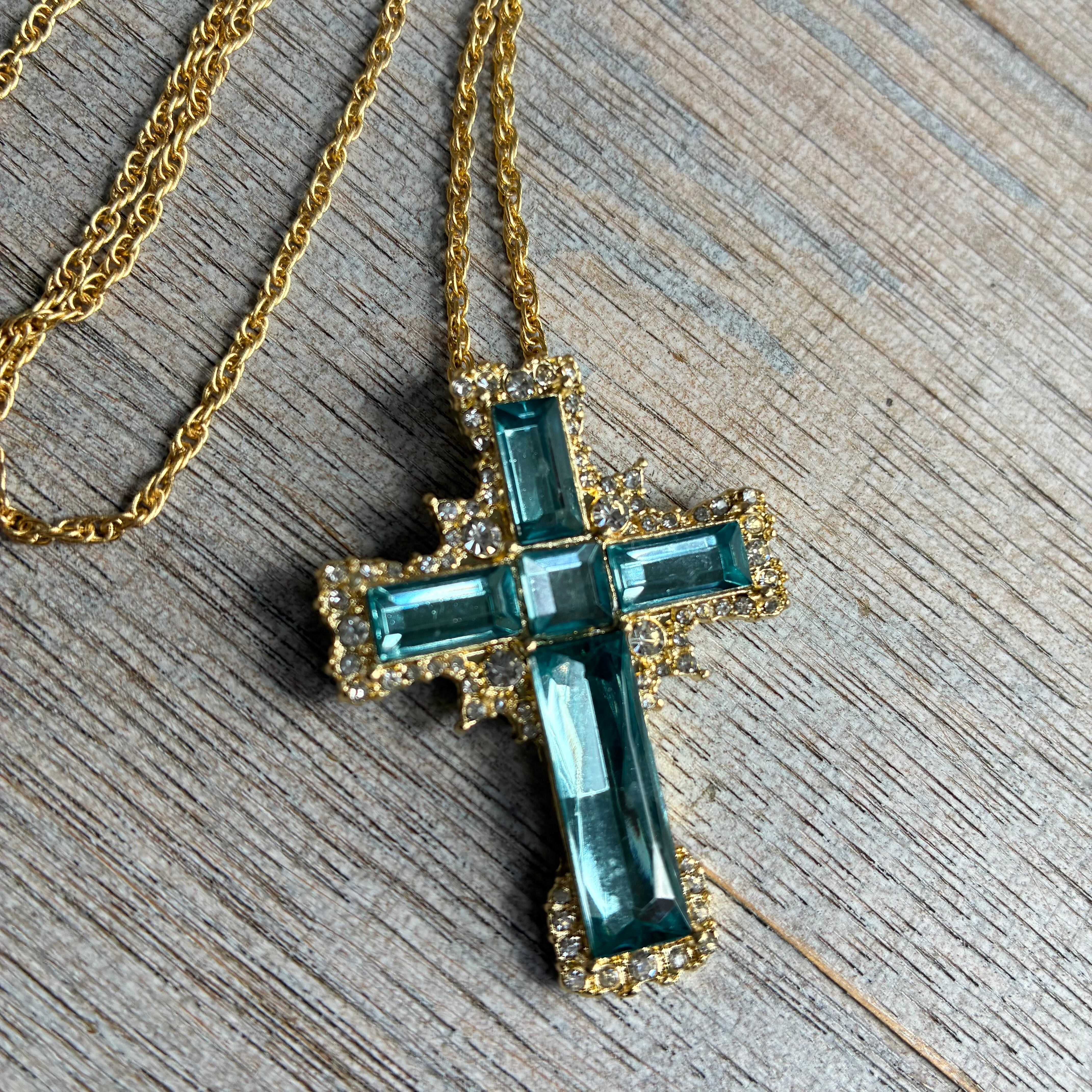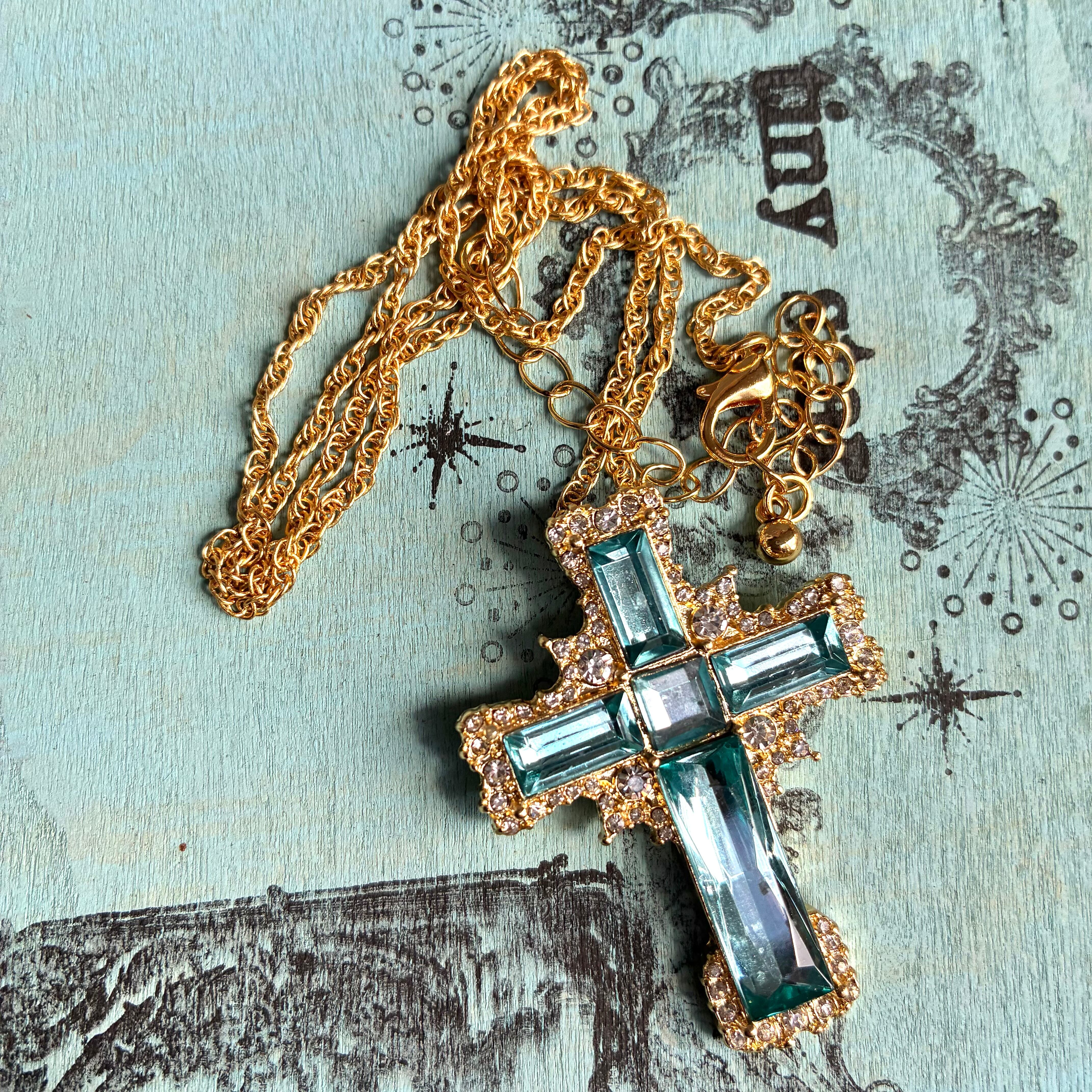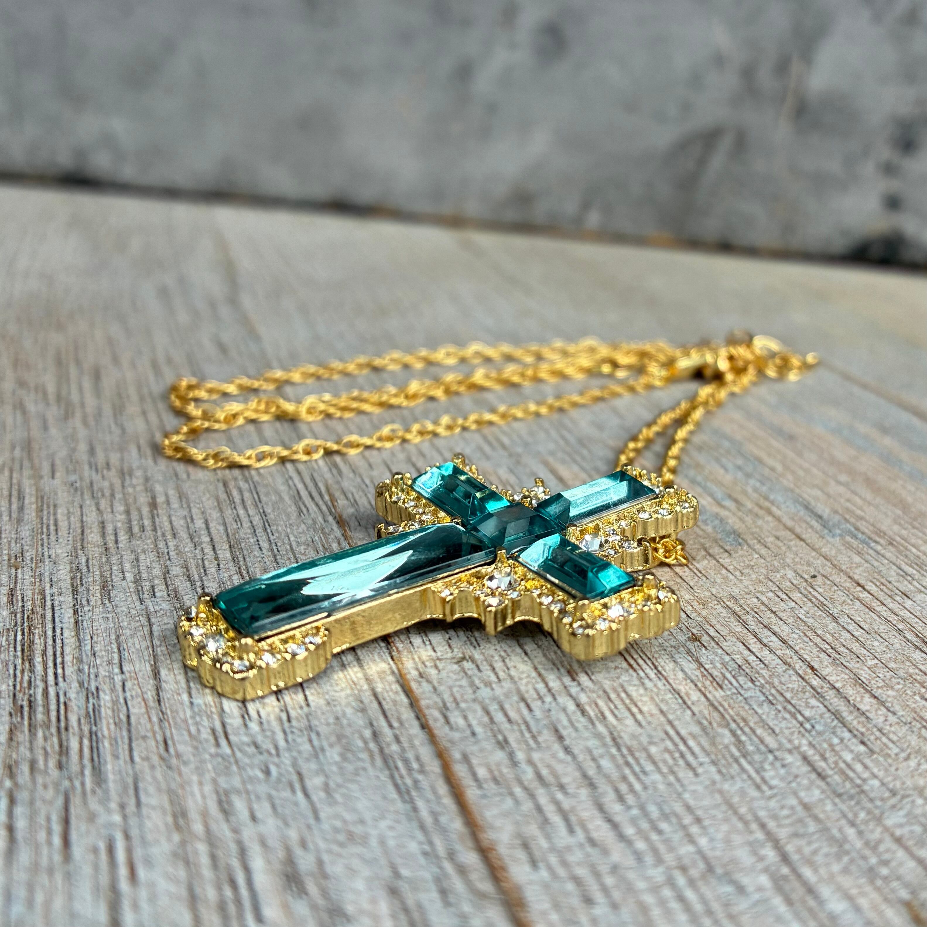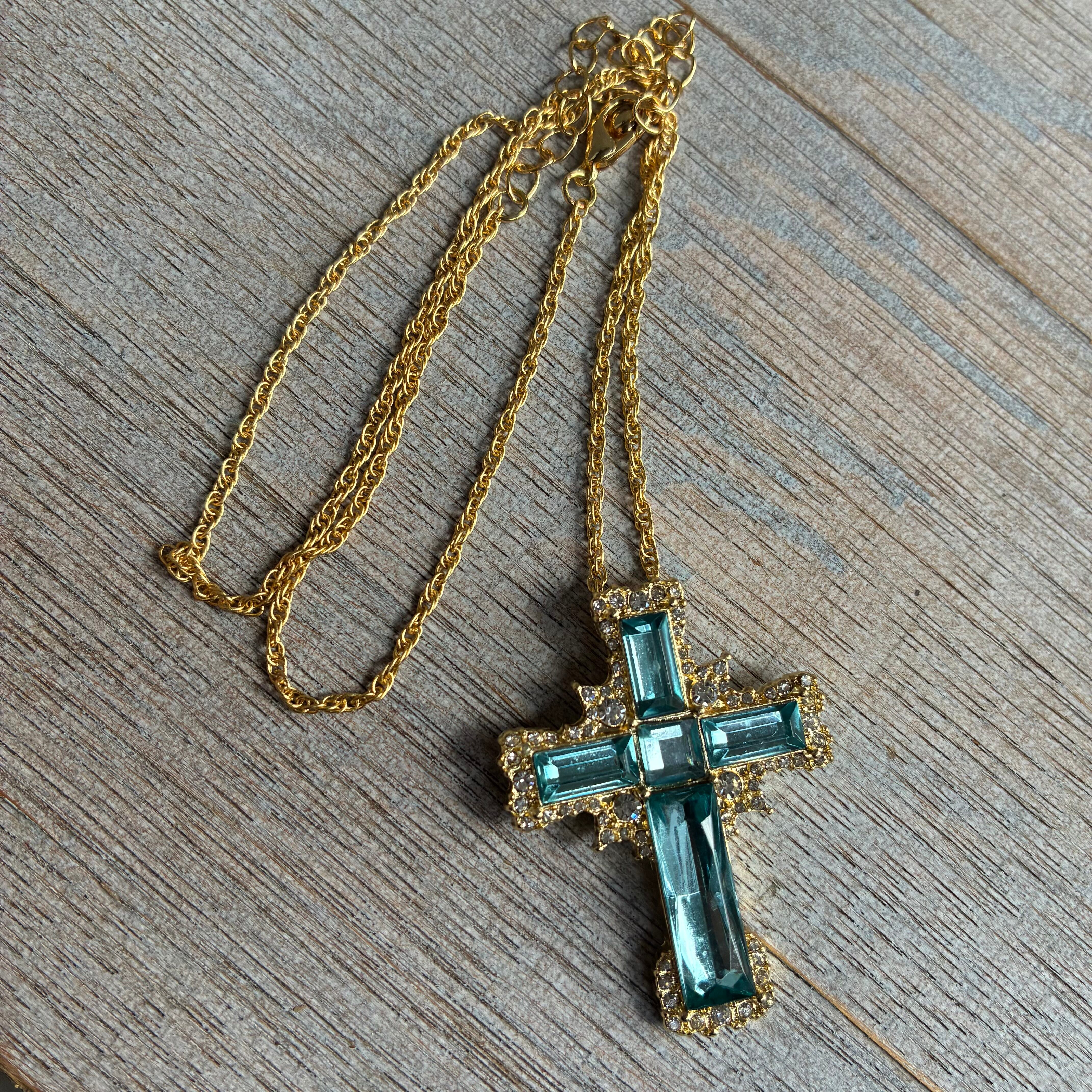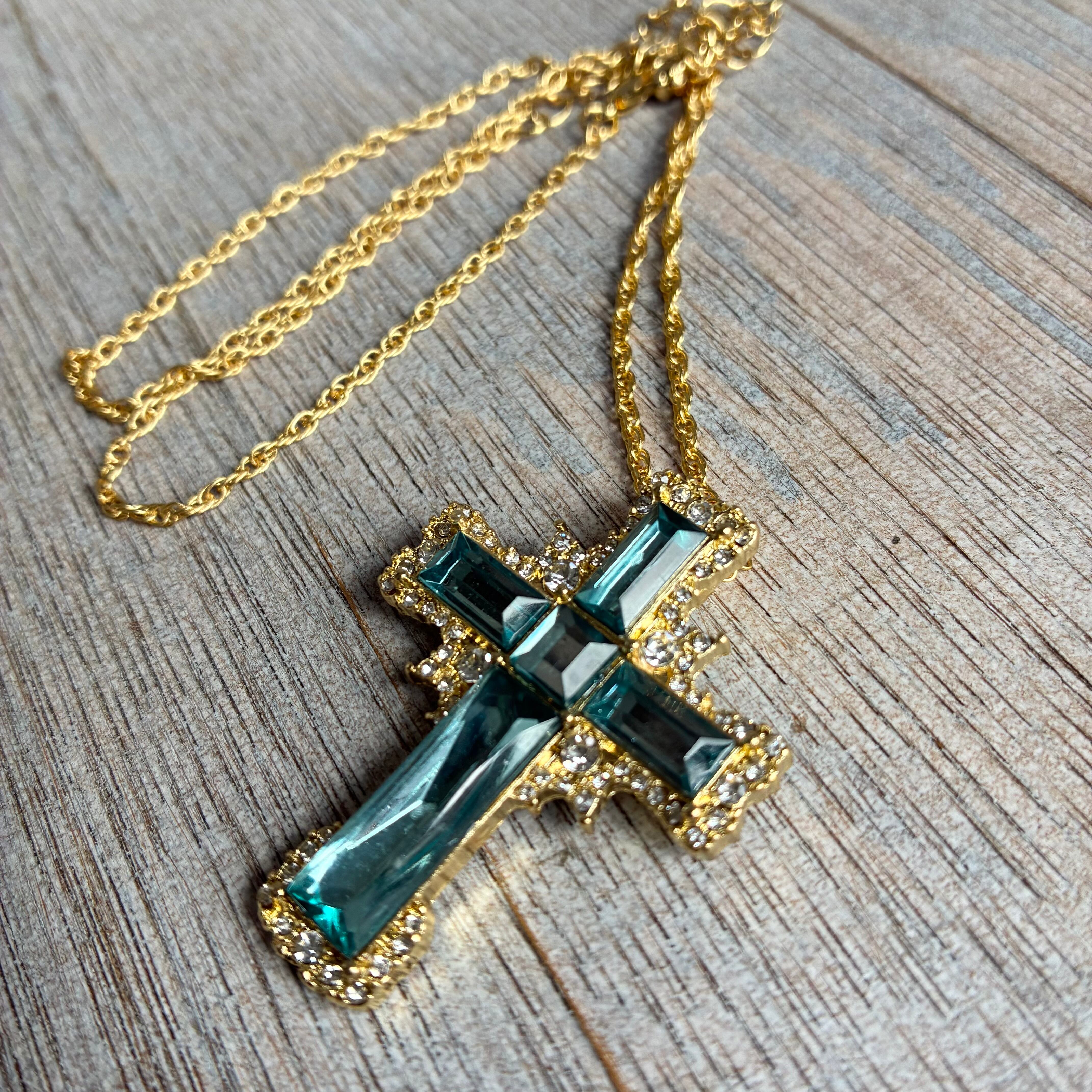 水色のストーン、豪華なラインストーンが散りばめられたキラキラクロスチャームのネックレスです。