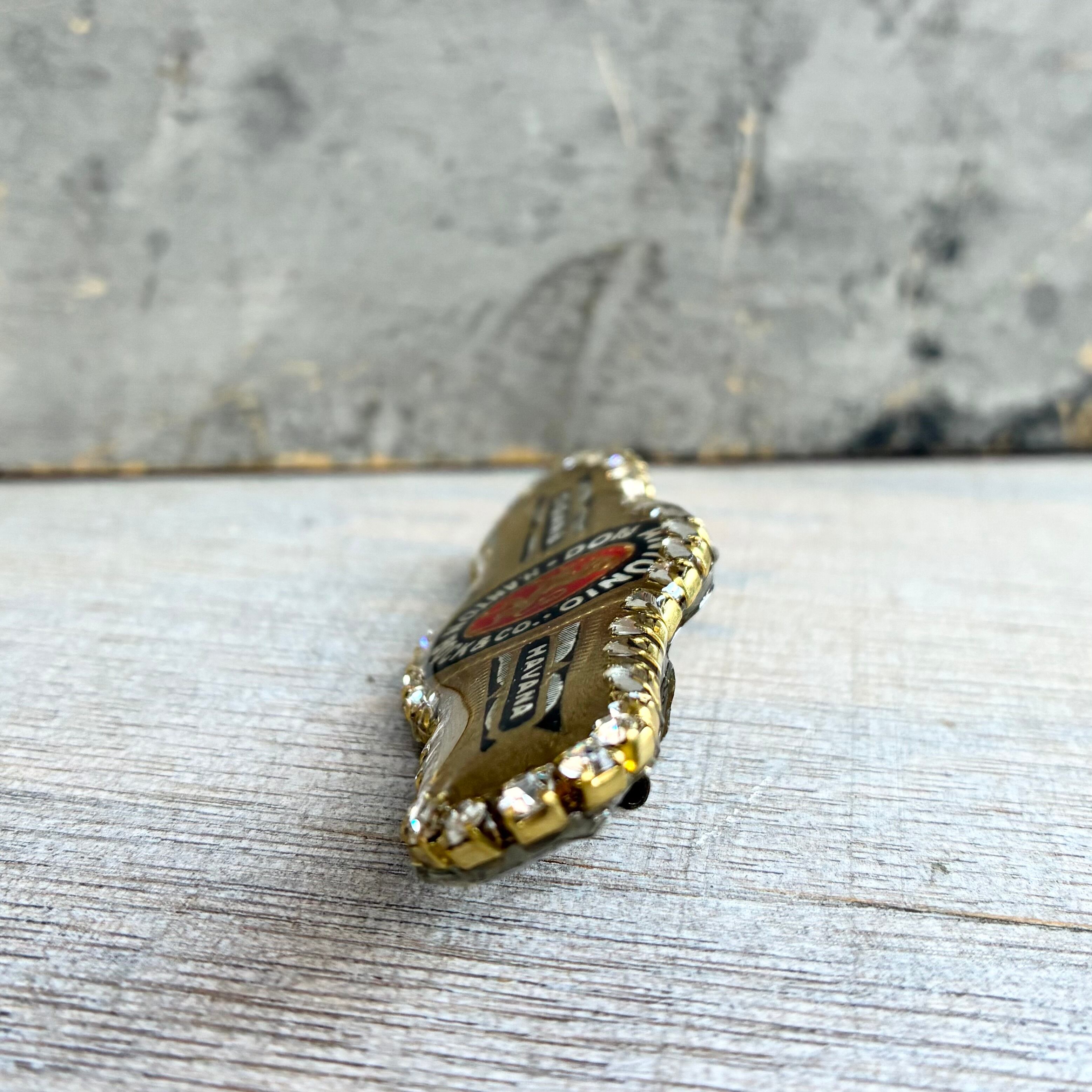 1940年代のヴィンテージのシガーラベルにラインストーンを飾ってレジンでコーティングしピンバッジにしました!