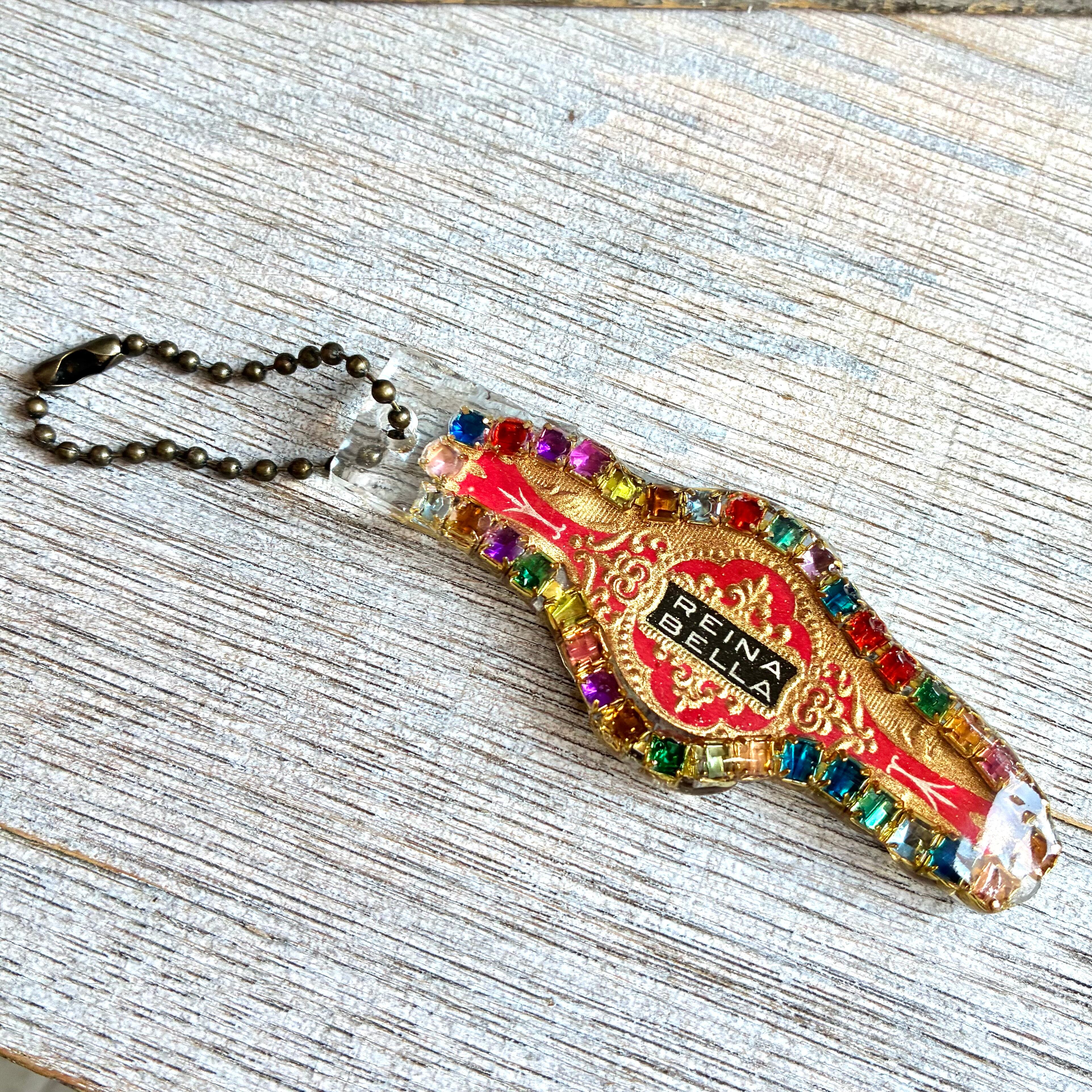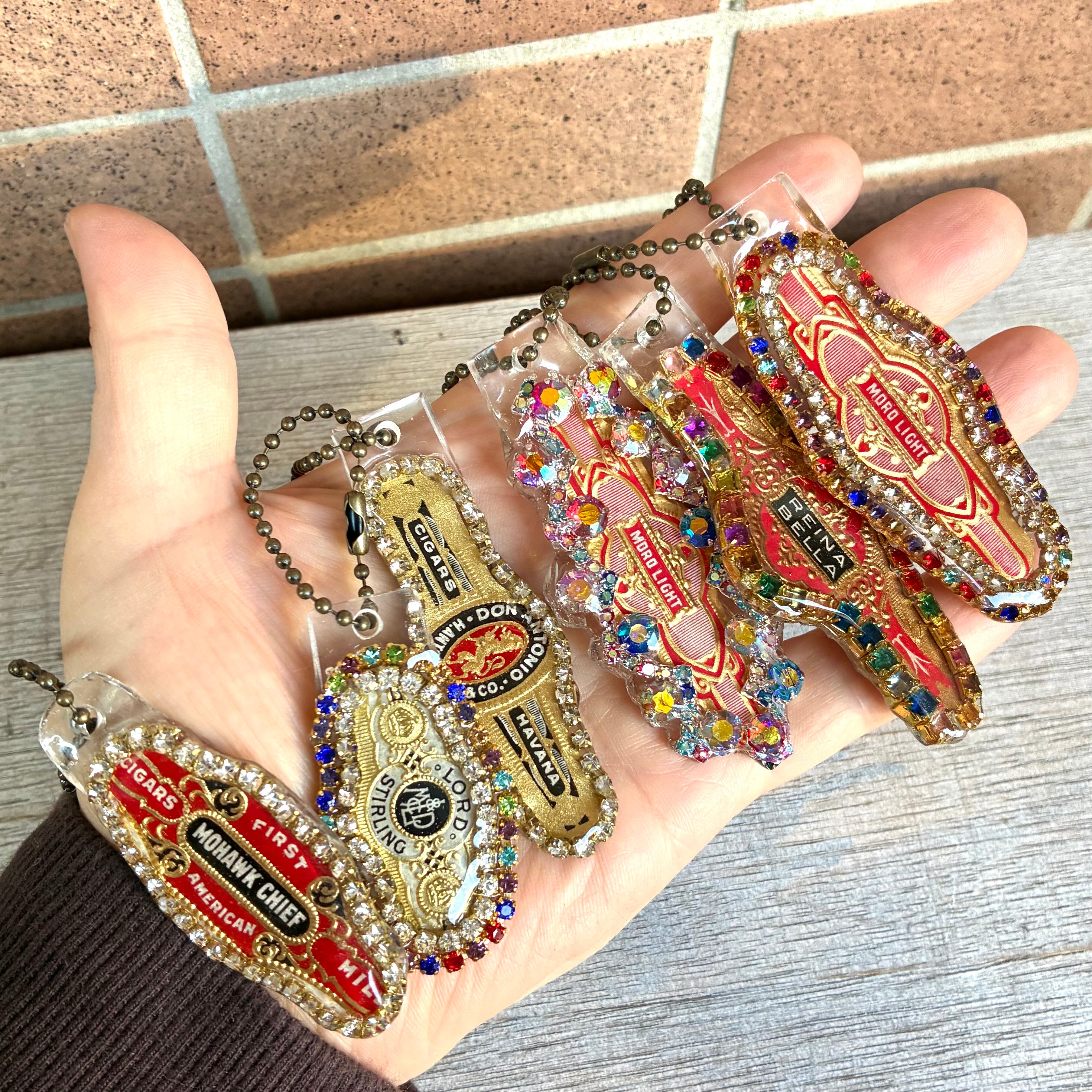 1940年代のヴィンテージのシガーラベルにラインストーンを飾ってレジンでコーティングしボールチェーンキーホルダーにしました!
