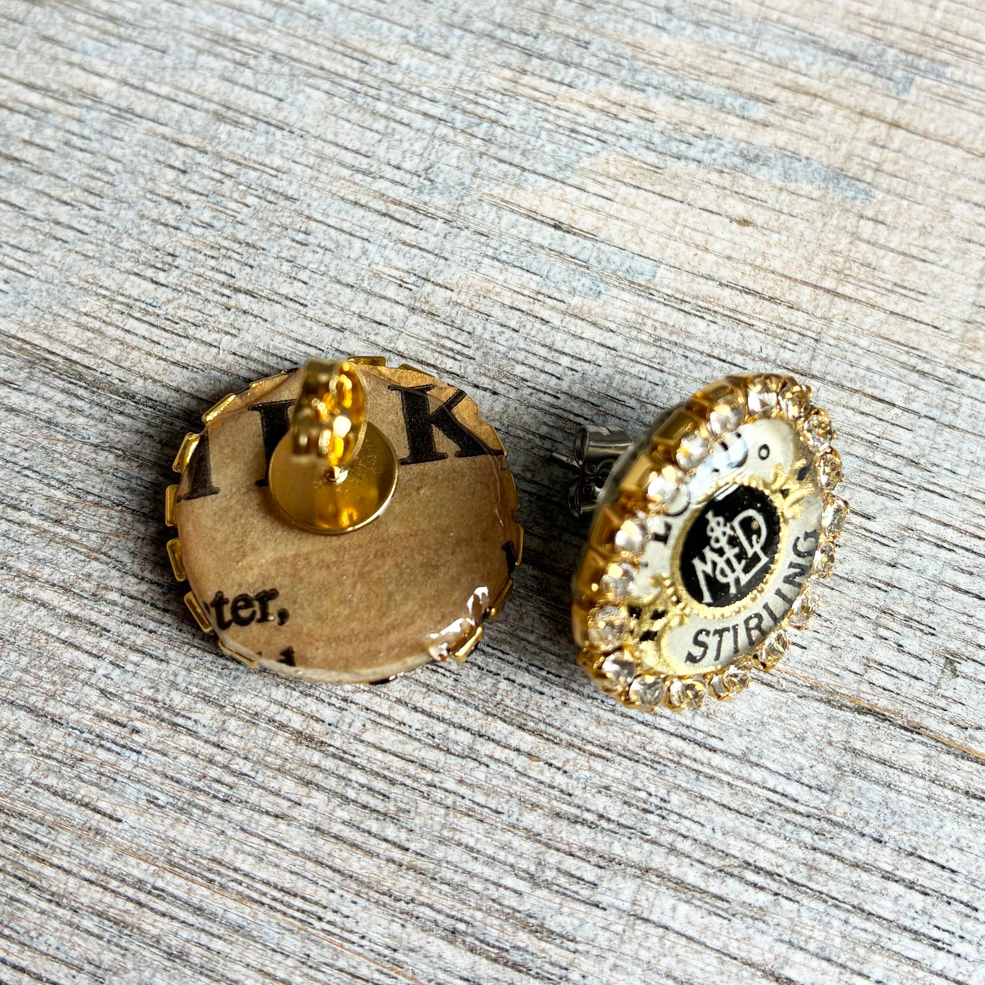 1940年代のヴィンテージのシガーラベルのエンブレムを切り取り、ラインストーンを飾ってレジンでコーティングしピアスにしました!