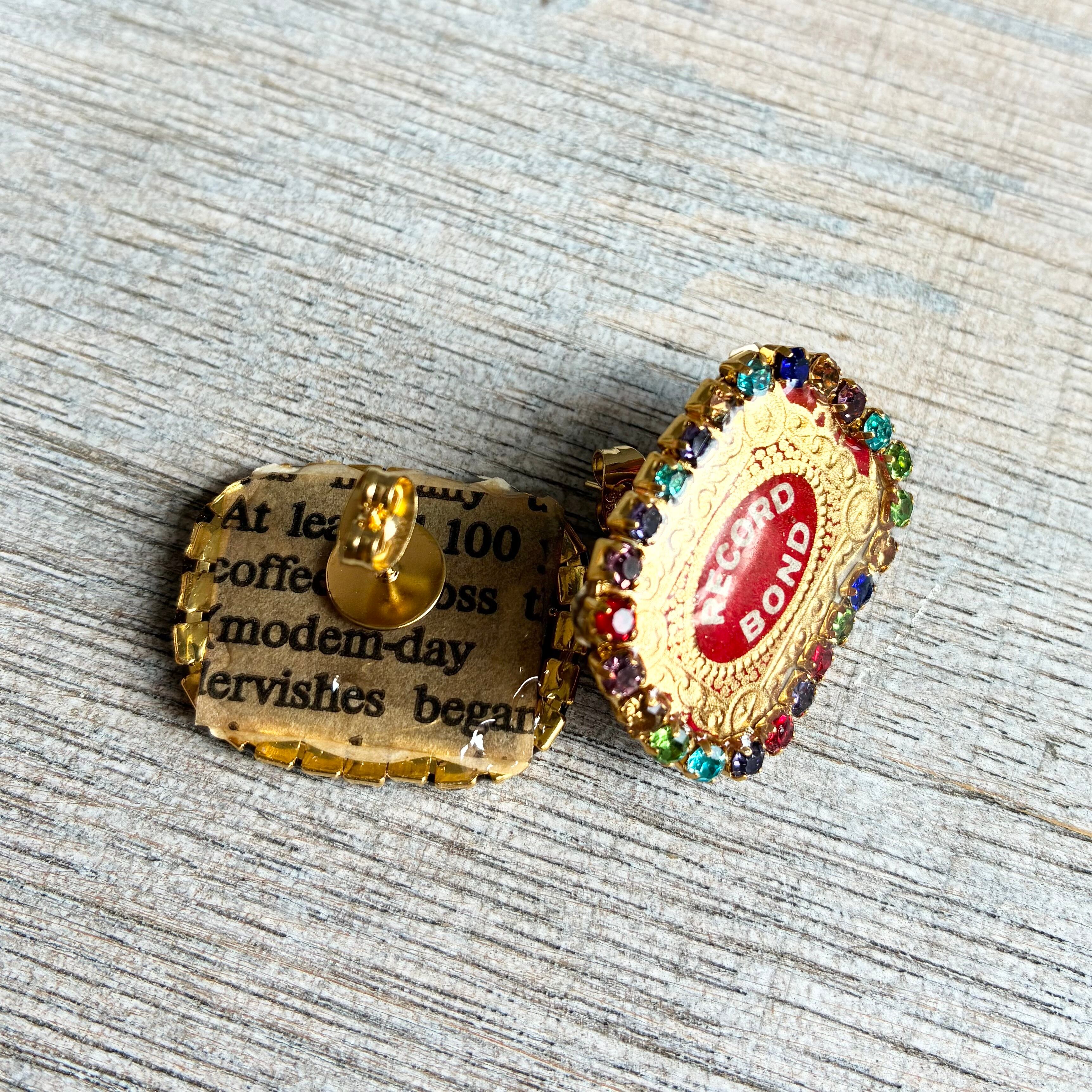 1940年代のヴィンテージのシガーラベルのエンブレムを切り取り、ラインストーンを飾ってレジンでコーティングしピアスにしました!