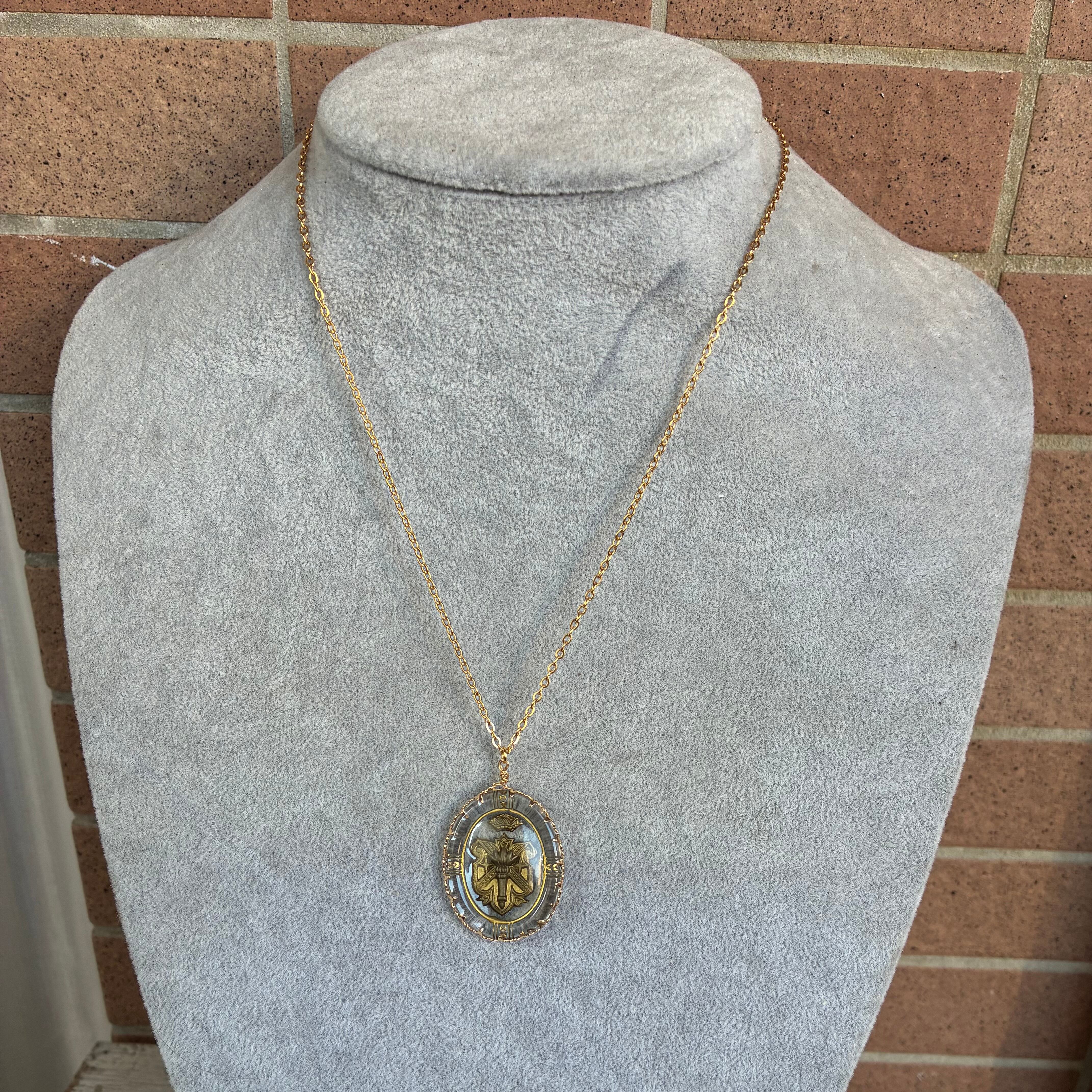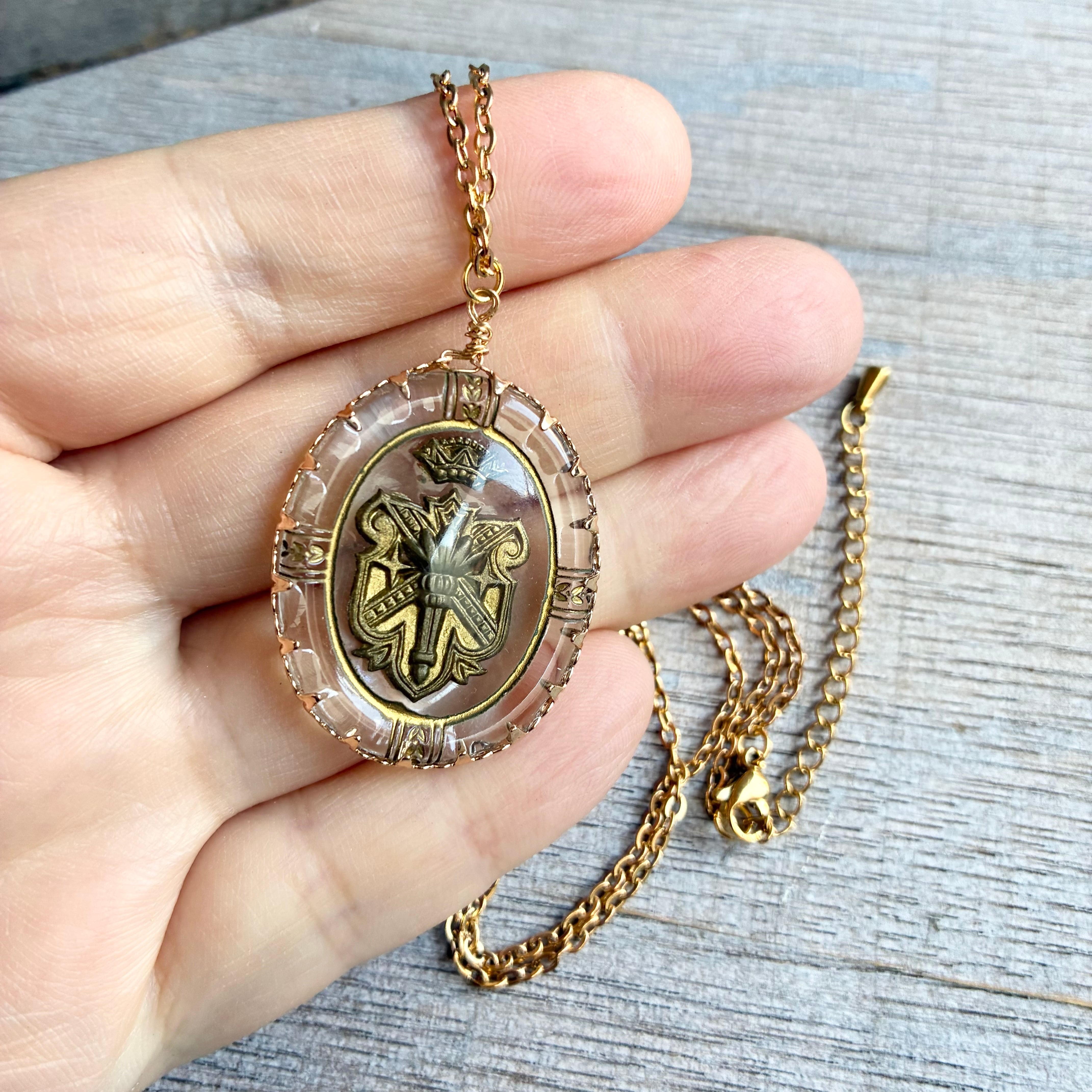 ヴィンテージ ビッグ クリア エンブレム グラス インタリオ カボション ネックレス ペンダント サージカルステンレス316L ビンテージ メンズ かっこいい ゴールド レア カッコいい 紋章
