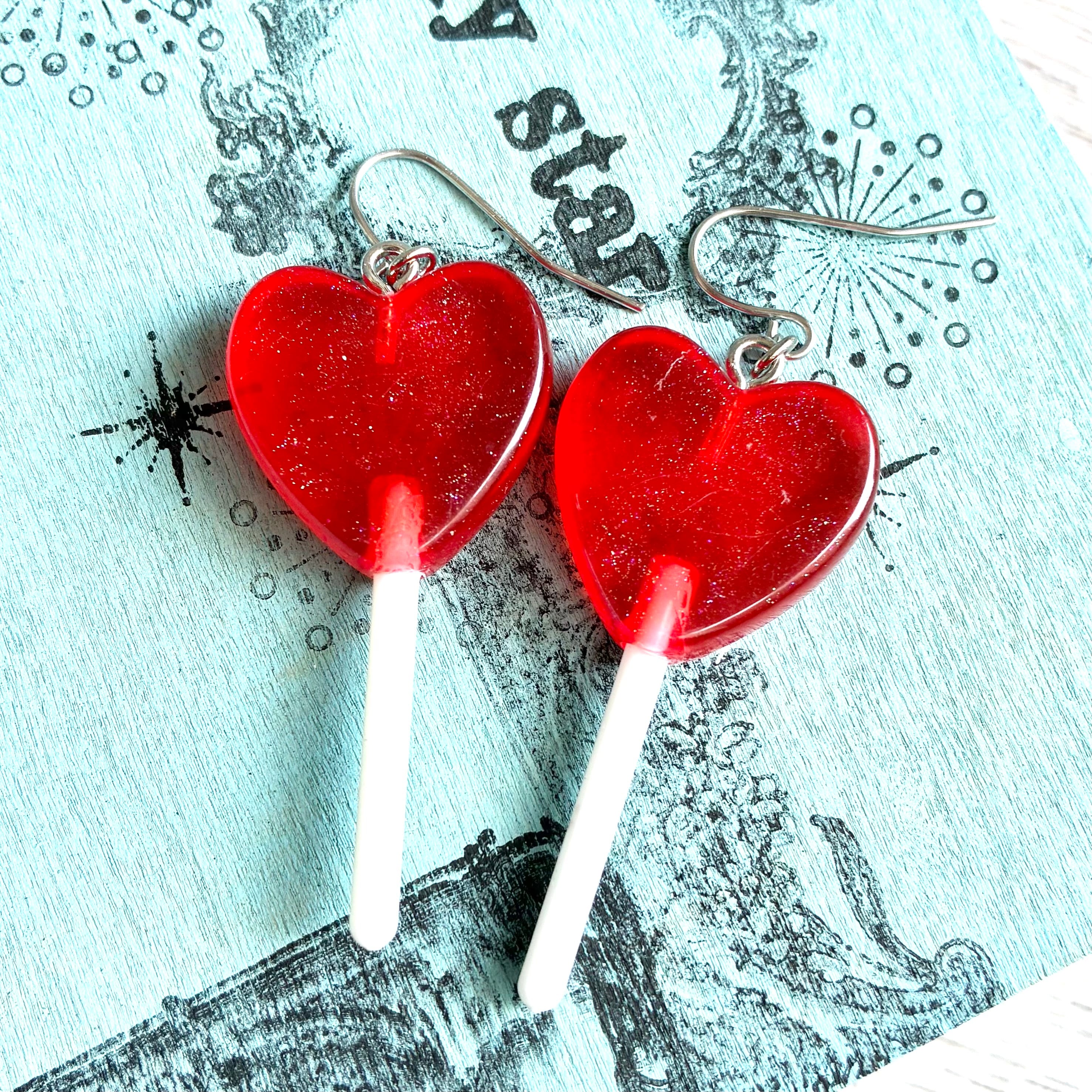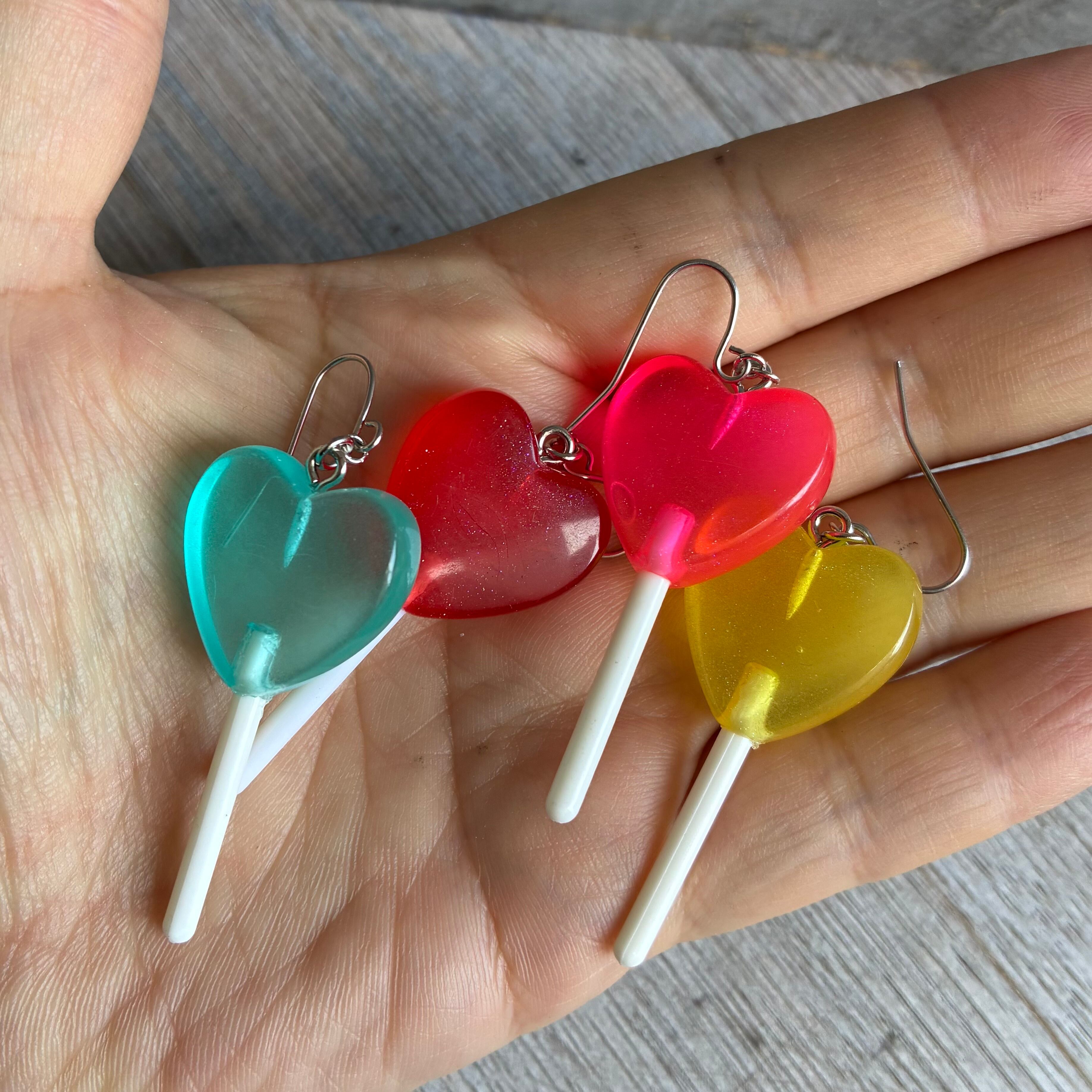 思わず食べたくなってしまうようなミニチュアのハート形ロリポップのユニークなピアスです✨