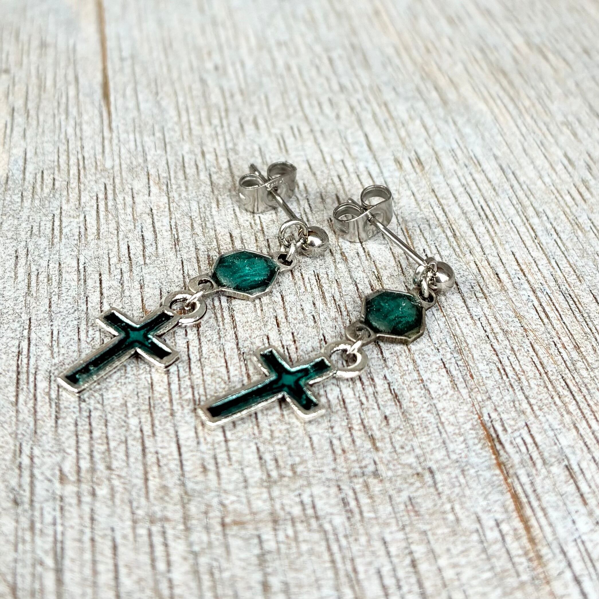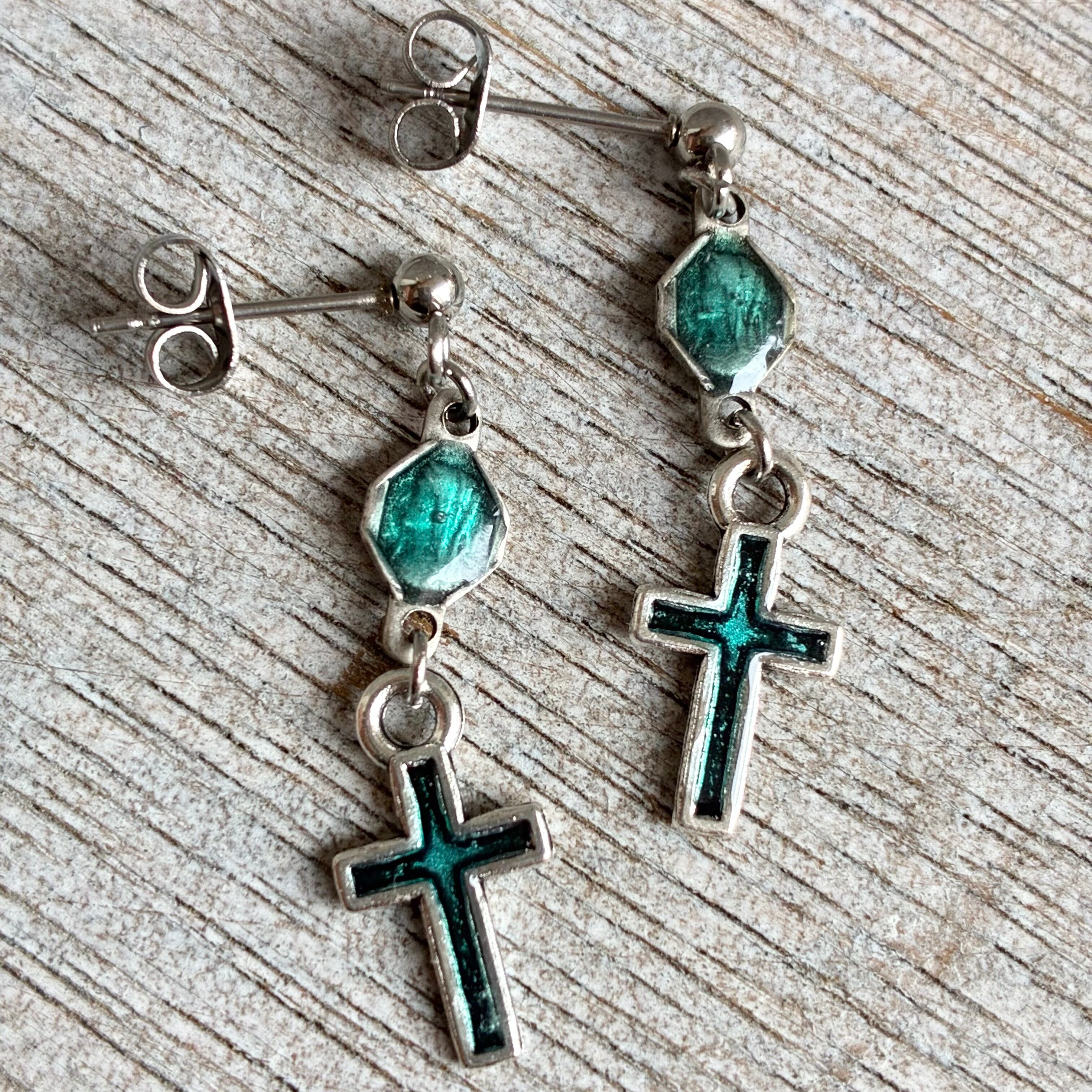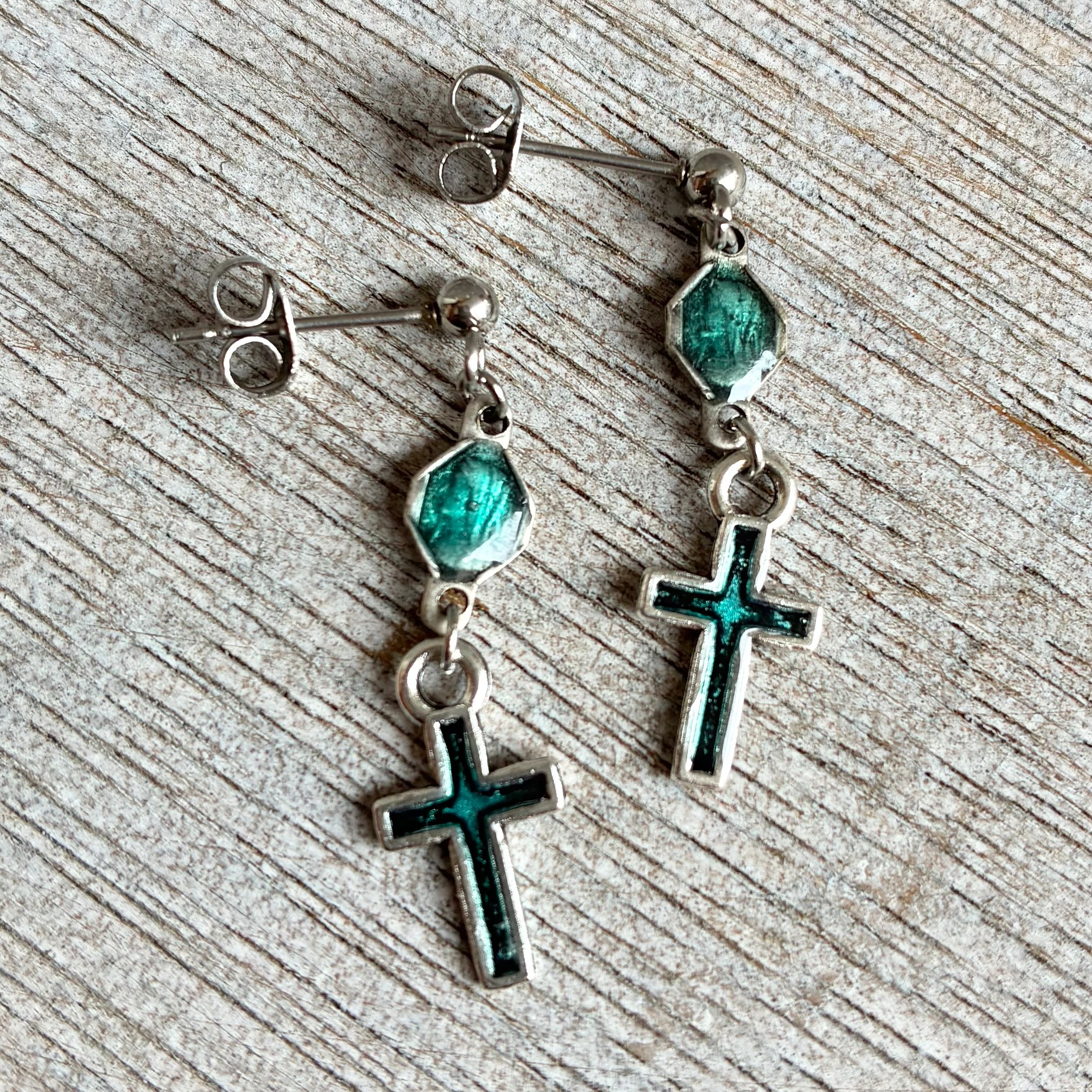 とても小さな1960'sフランス製ヴィンテージのマリア様が描かれたコネクターにミニクロスチャームを合わせて、古びたブルーに色付けしてピアスにしました!