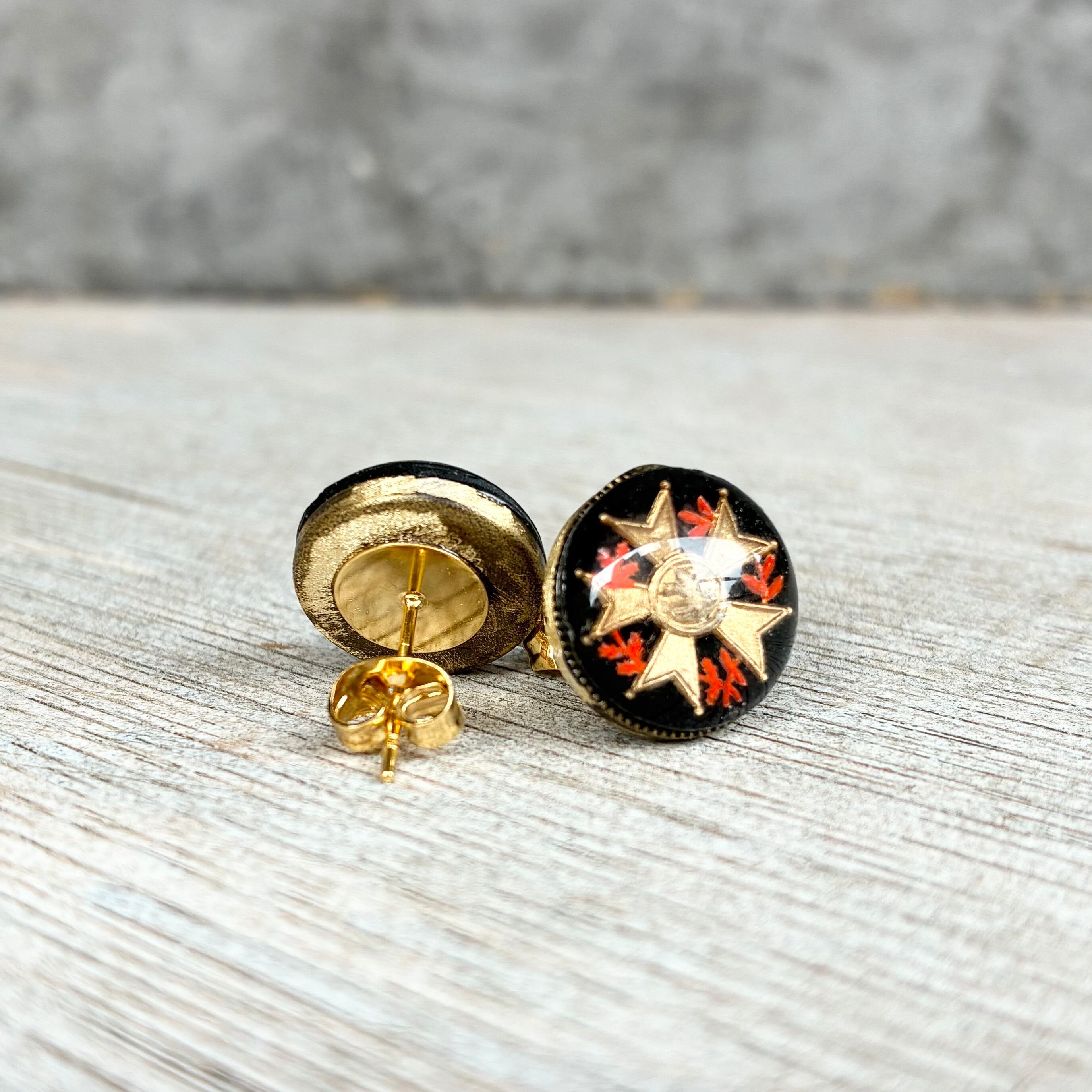 一点物 レア ヴィンテージ ブラック レッド ゴールド エンブレム インタリオ カボション ピアス ステンレス 黒 赤 金 昭和レトロ 紋章 メンズ かっこいい