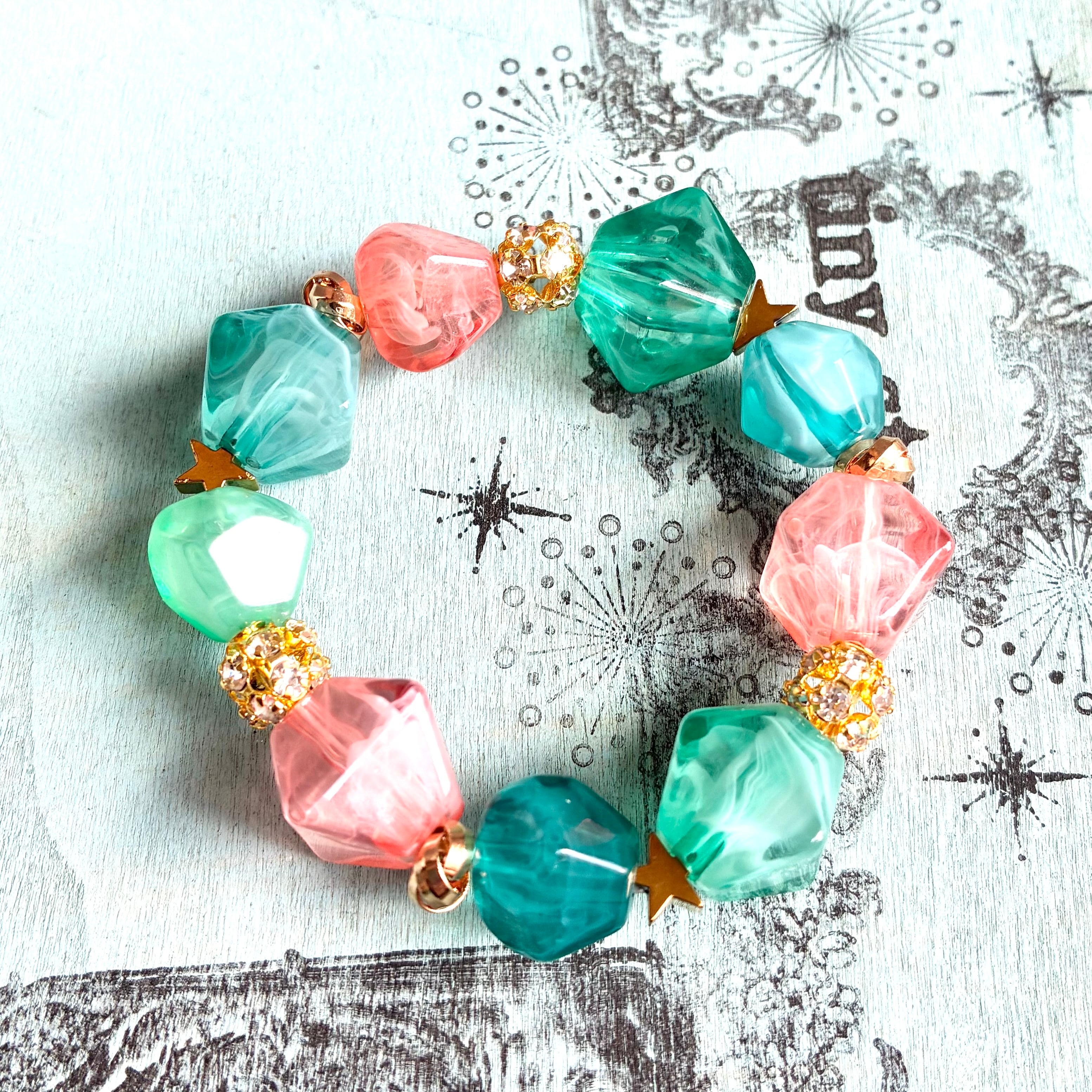 天然石みたいなマーブル模様のカクカクした大きめのピンク、グリーン、ブルーのアクリルビーズ、ミラーボールみたいなラインストーンボール、ヘマタイトの星ビーズ、ツイストロンデルを合わせて、子供っぽさもありつつ大人でも楽しめるような組み合わせにしました。