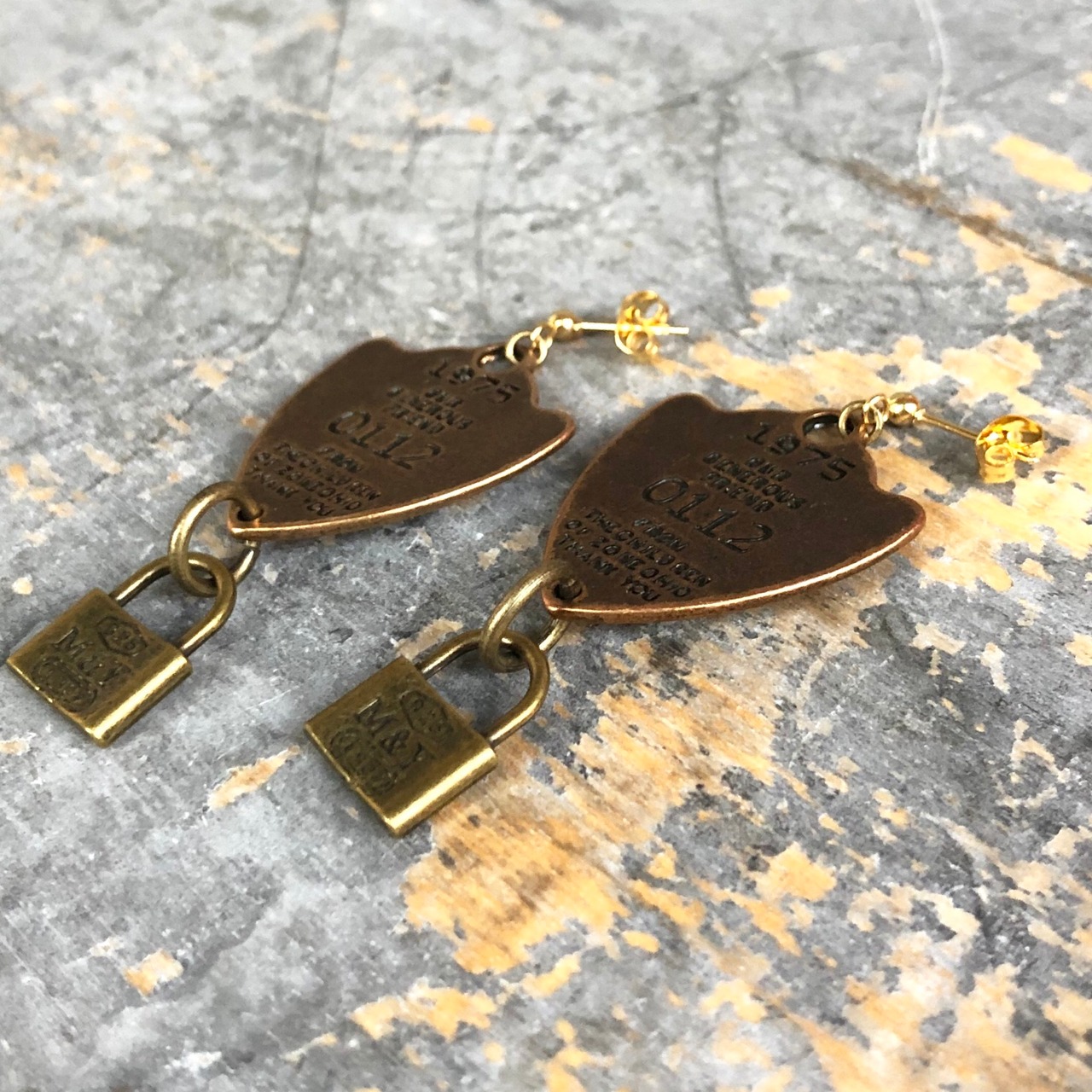 ヴィンテージ風トライアングルライセンスタグチャームと南京錠大ぶりピアス