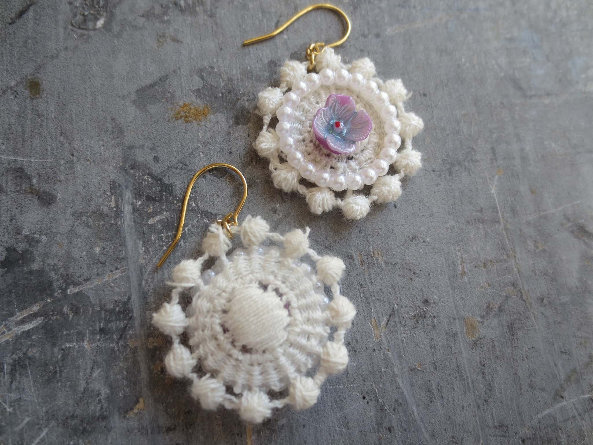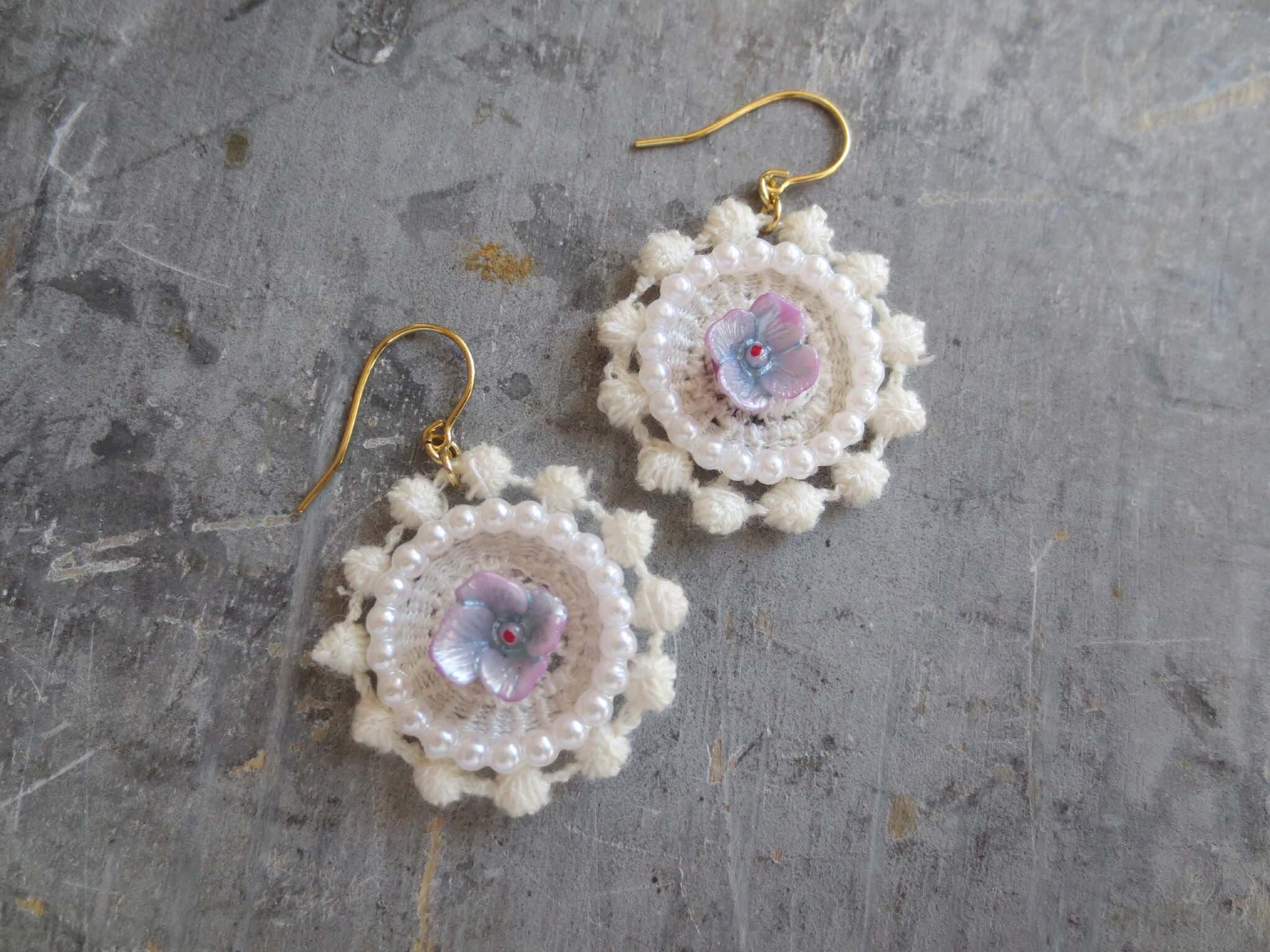 ヴィンテージのスミレのカボションとレースモチーフ、パールフープを合わせてピアスにしました★