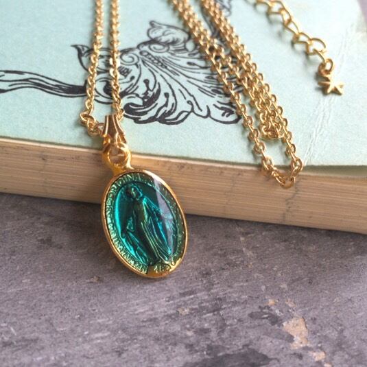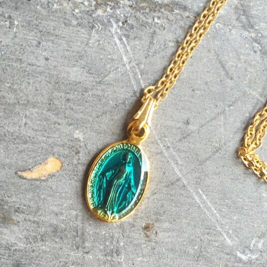 ブルーとマリア様のメダイの柄がとても美しいシンプルなメダイネックレスです。