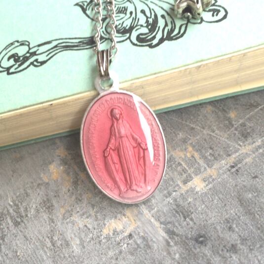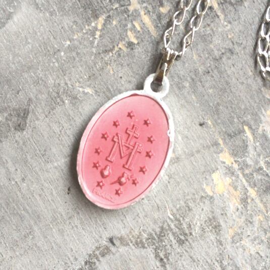 ヴィンテージ聖母マリアオーバル不思議のメダイネックレス(ローズピンク)