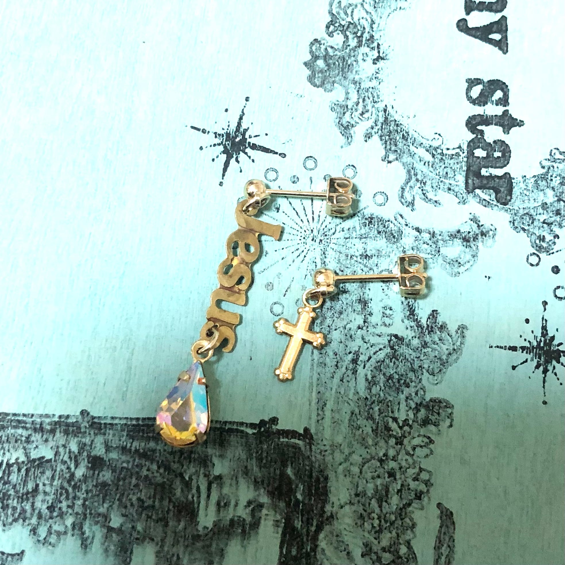 ジーザスロゴチャームヴィンテージドロップストーンアシンメトリーピアス