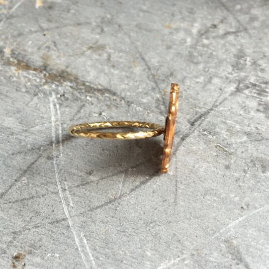 スタンピングのカラーは赤みのあるコッパー、リングのカラーはゴールドでカラーは違いますが、付けていて違和感は感じませんでした。