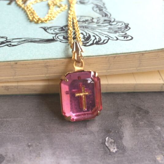ヴィンテージのクロスが彫られたグラスストーンを使用したネックレスです。