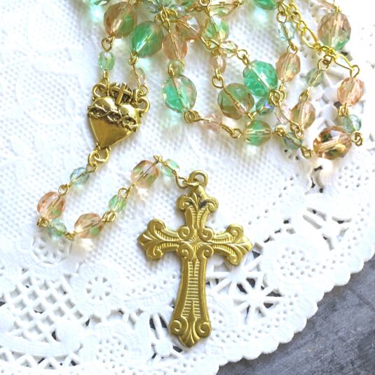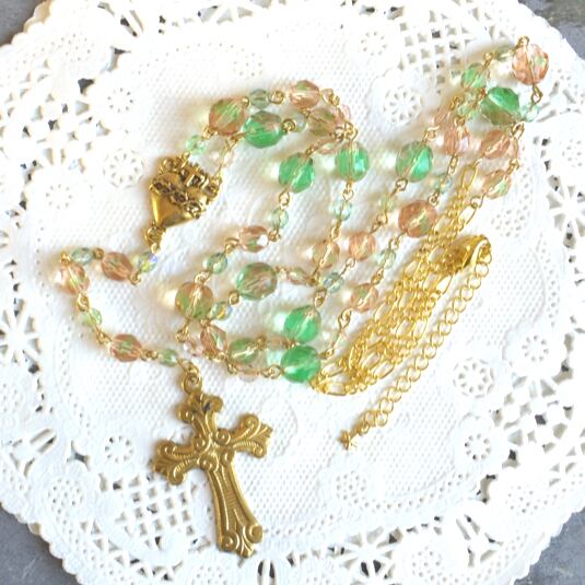 ペリドットとヴィンテージピーチのグラデーションが綺麗なグラスビーズと、ヴィンテージクロスを合わせたロザリオです。