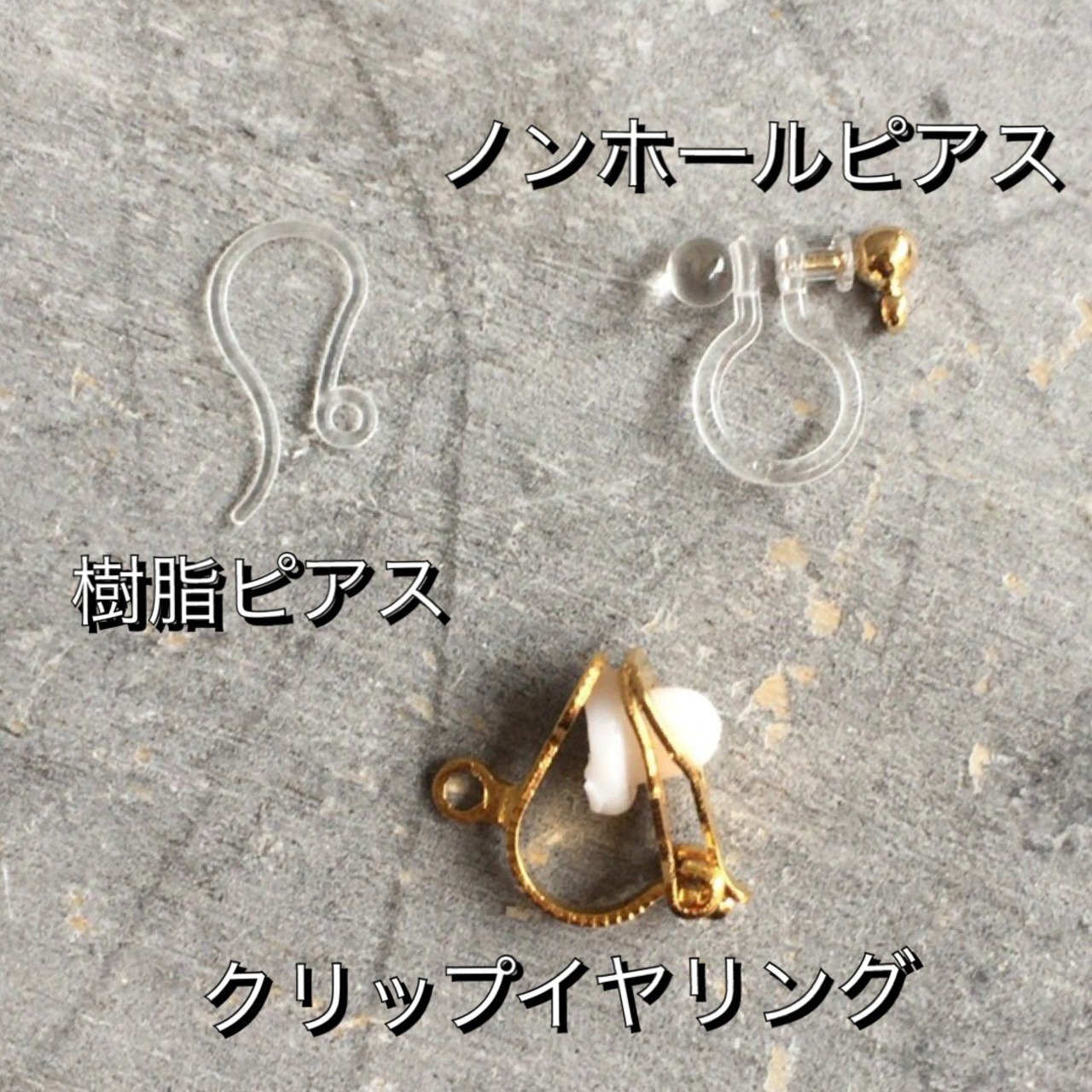 金属アレルギーの方は透明樹脂ピアスに変更可能!ピアスを開けていない方用にクリップイヤリング、ノンホールピアスにも変更可能です!ご注文の際備考欄にご希望を記入してください。