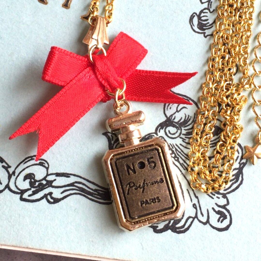 国産の上質なサテンリボンと、アンティークゴールドとゴールドのたNo.5パフュームボトルをあわせて上品なネックレスにしました!