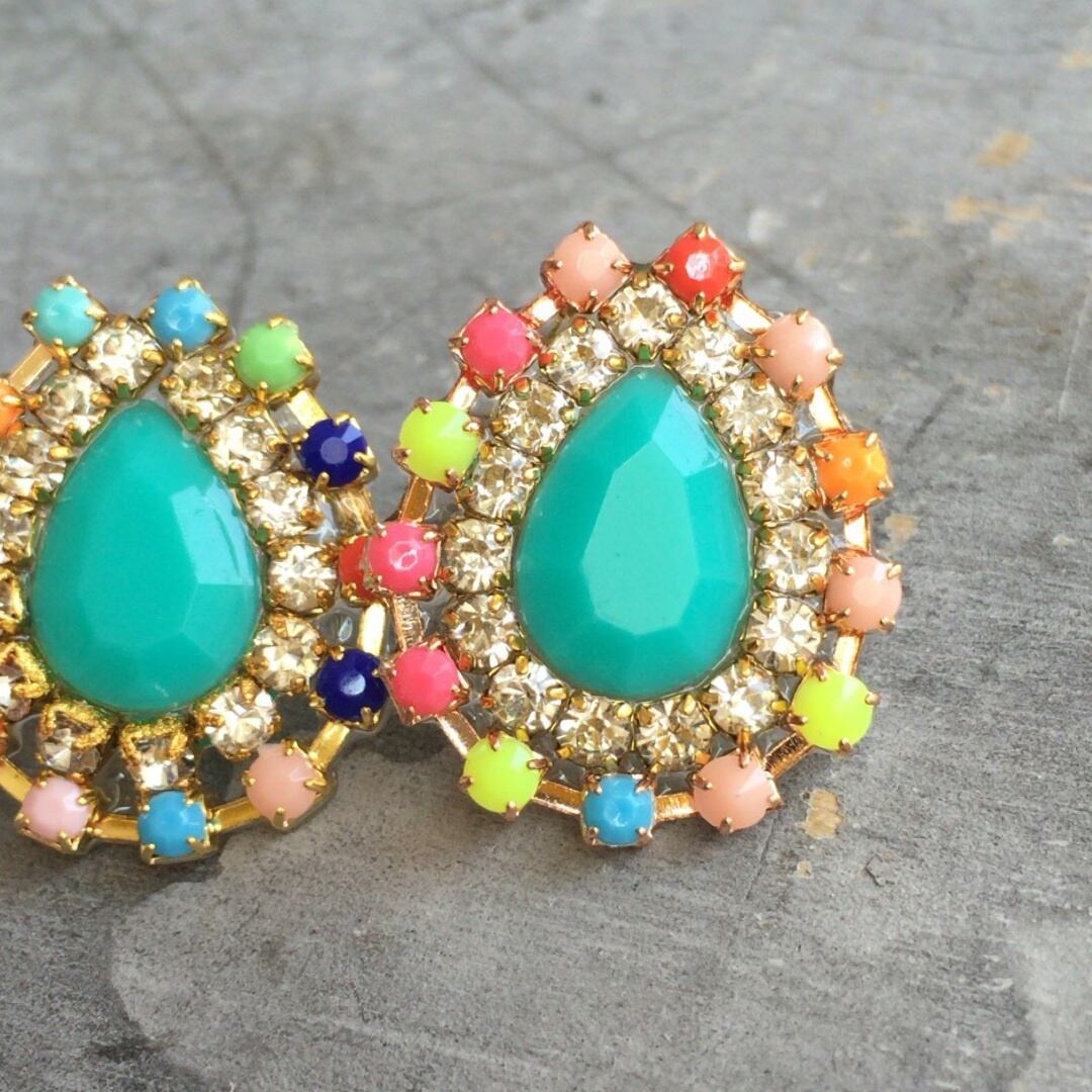 鮮やかで爽やかなティファニーブルーのような、ターコイズのようなカラーのアクリルストーンの周りに、クリスタルのガラスストーン、更にその周りにカラフルなアクリルストーンを飾ってピアスにしました!