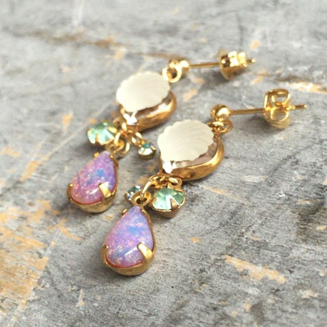 可愛らしいマットなシェルのヴィンテージカボションと万華鏡を覗いているみたいな色合いのピンクファイヤーオパール風のヴィンテージドロップストーン、光の加減でパープルやブルーに輝くヴィトレイルライトのヴィンテージスワロフスキーラインストーン、グリーンがかったアクアマリンのヴィンテージラウンドラインストーンを使用したピアスです!