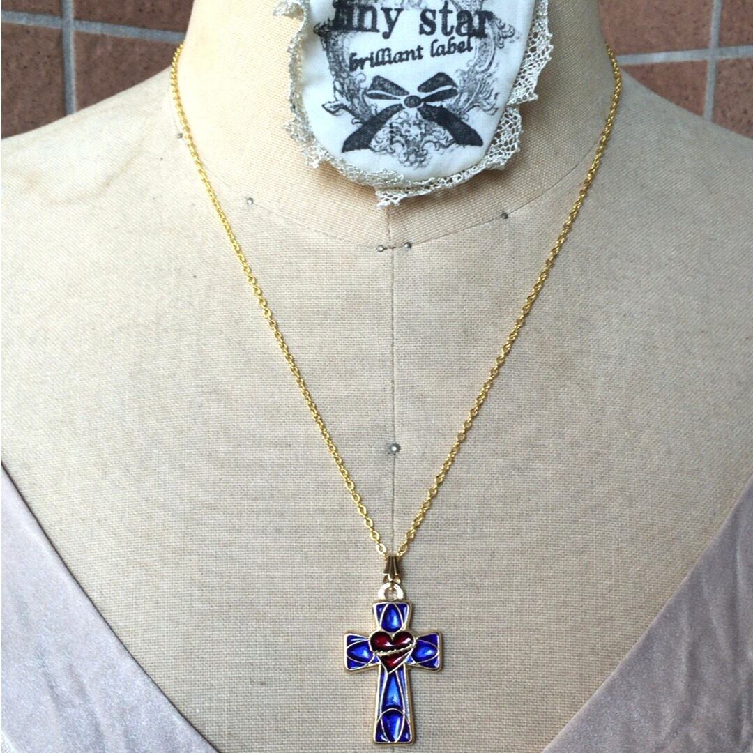 ステンドグラスのようなクロス、いばらが巻かれたハートがデザインされた美しいチャームネックレスです★