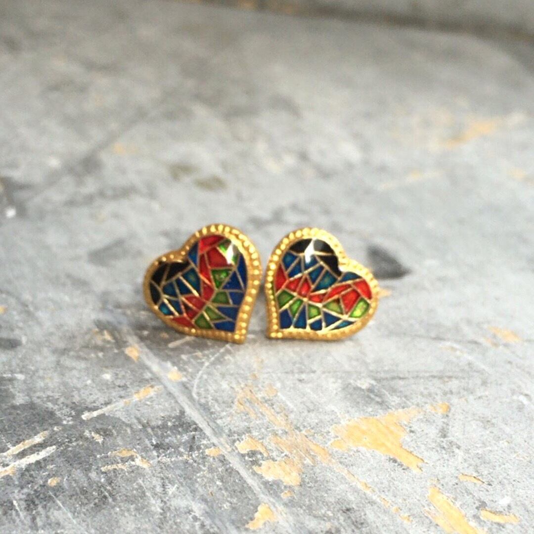ヴィンテージのカラフルなステンドグラス風のハートチャームを使用したピアスです✨