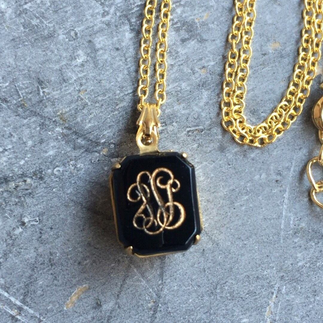 ヴィンテージのモノグラムが彫られたグラスストーンを使用したネックレスです。