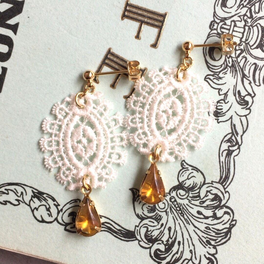 トパーズ、琥珀、べっ甲、ハチミツ、あめ色のようなカラーが美しく大人っぽい雰囲気のヴィンテージドロップストーンと、日本製の繊細な生成色レースモチーフを合わせた大人可愛いピアスです!