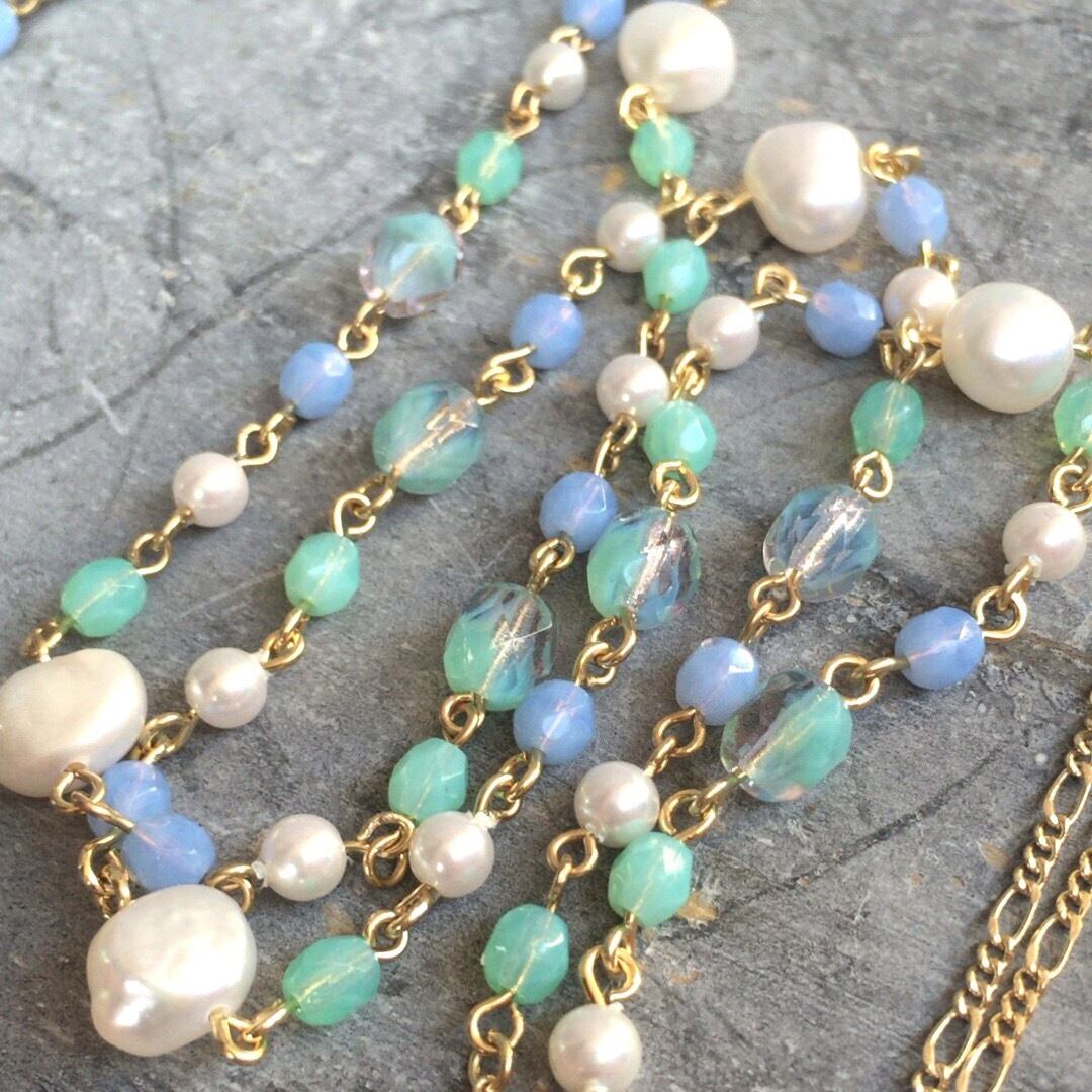 デットストッククロス淡水パールとチェコビーズのロザリオ(milky ocean)