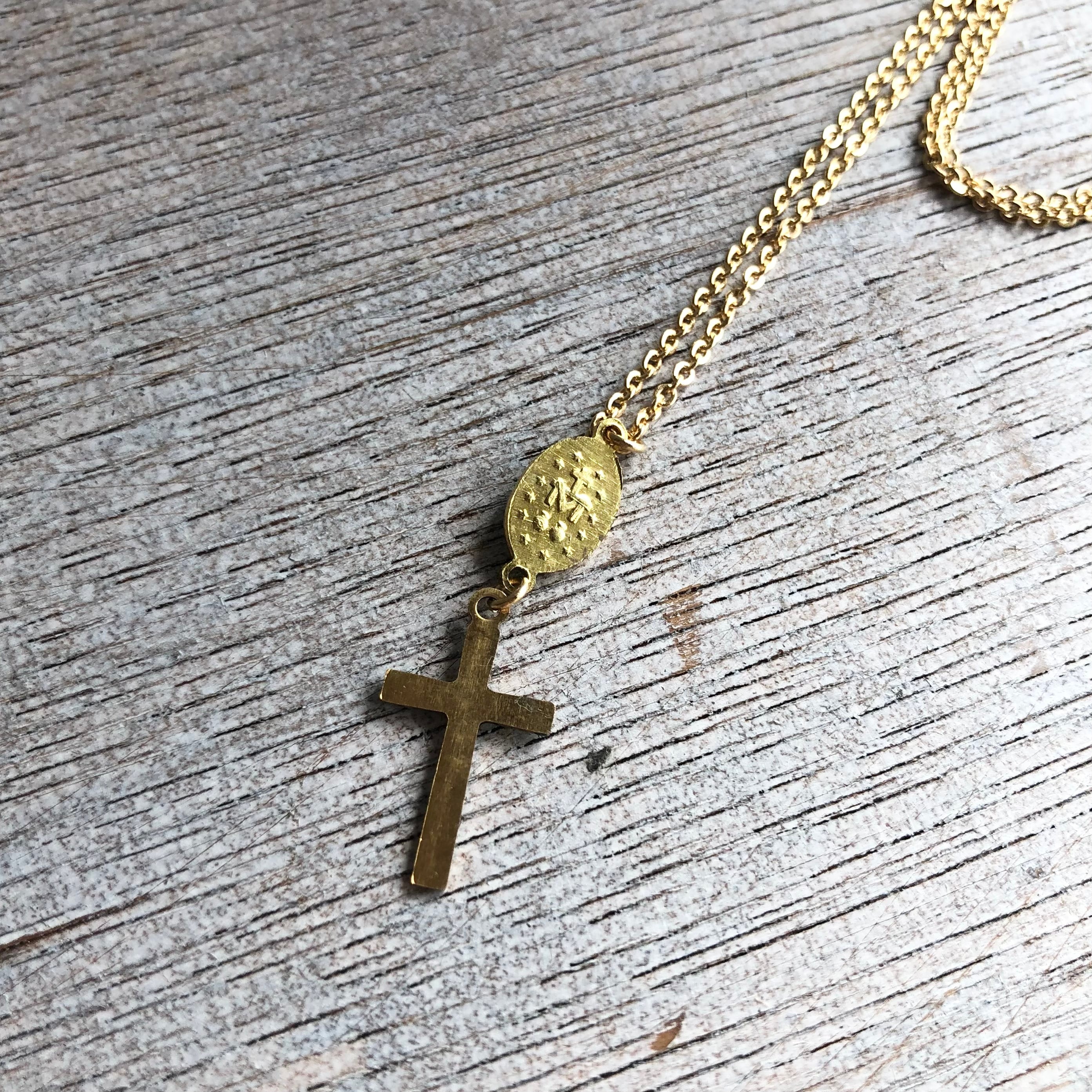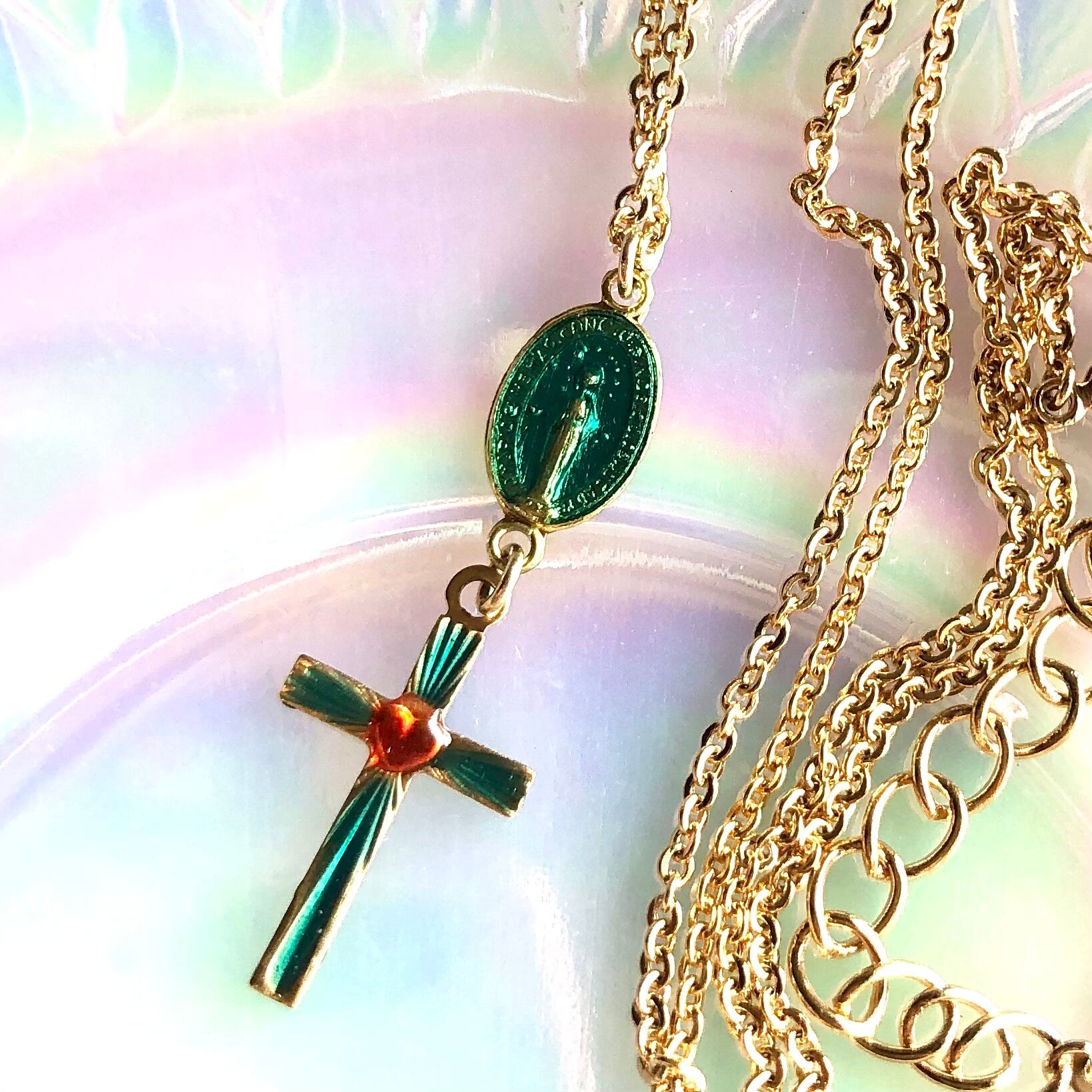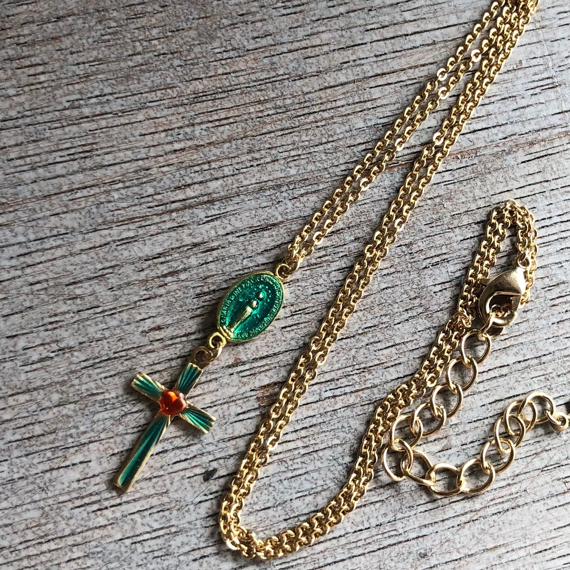 ヴィンテージ マリア様 コネクター ブルーグリーン クロス レット ハート ネックレス ペンダント