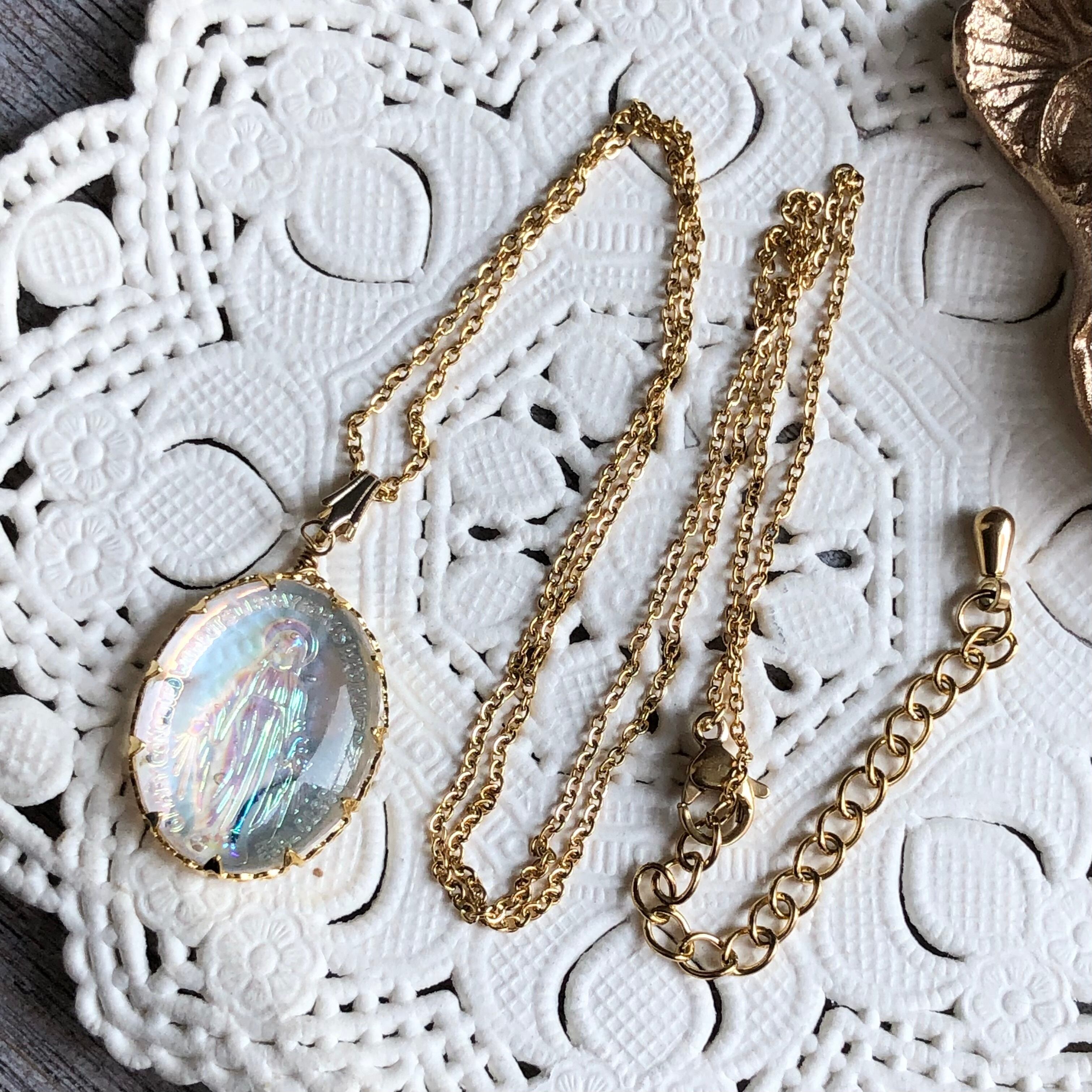 1970s ジャーマン ヴィンテージ マリア様 オーロラ インタリオ カボション ネックレス ペンダント サージカルステンレス316L メダイ Virgin Mary マリア アクセサリー