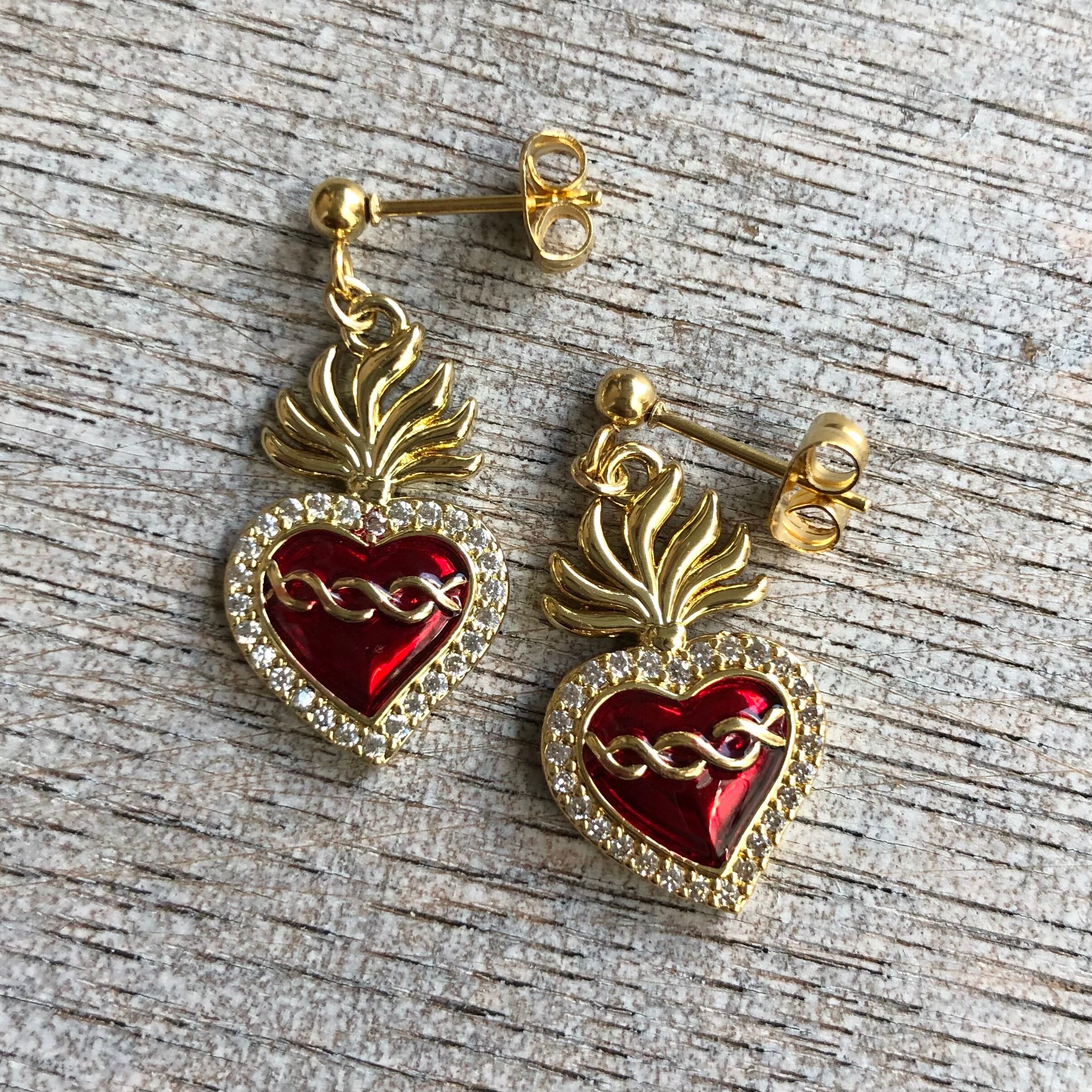 ハートにイバラが巻かれ、周りを囲んだキュービックジルコニアがキラキラ、後光で輝く燃える心臓、聖心モチーフのピアスです。